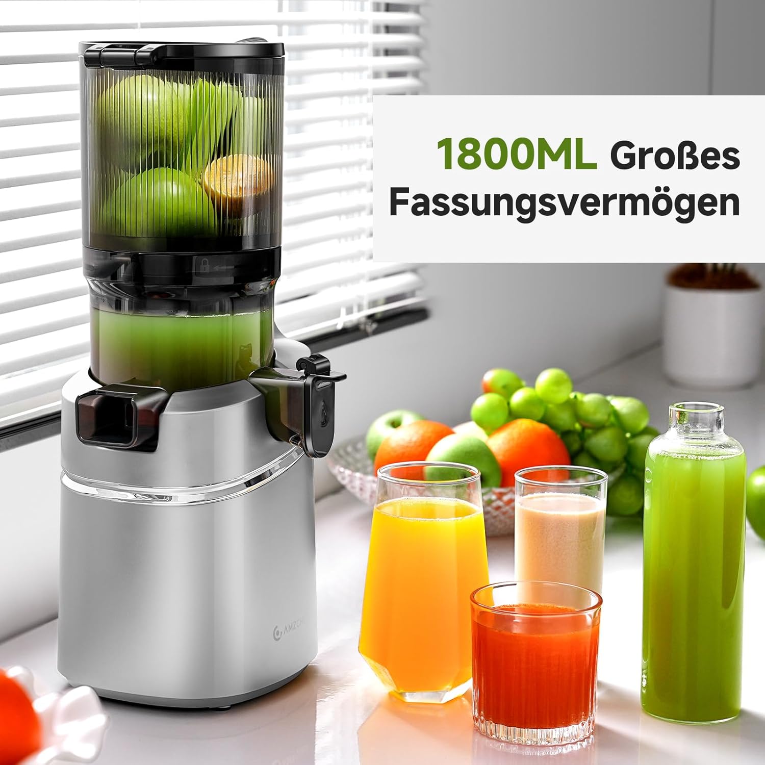 AMZCHEF 250 W автоматична многофункционална сокоизстисквачка, отвор 145 мм и 2 л сокоизстисквачка за зеленчуци и плодове, победител в теста за бавна сокоизстисквачка с троен филтър - сребриста