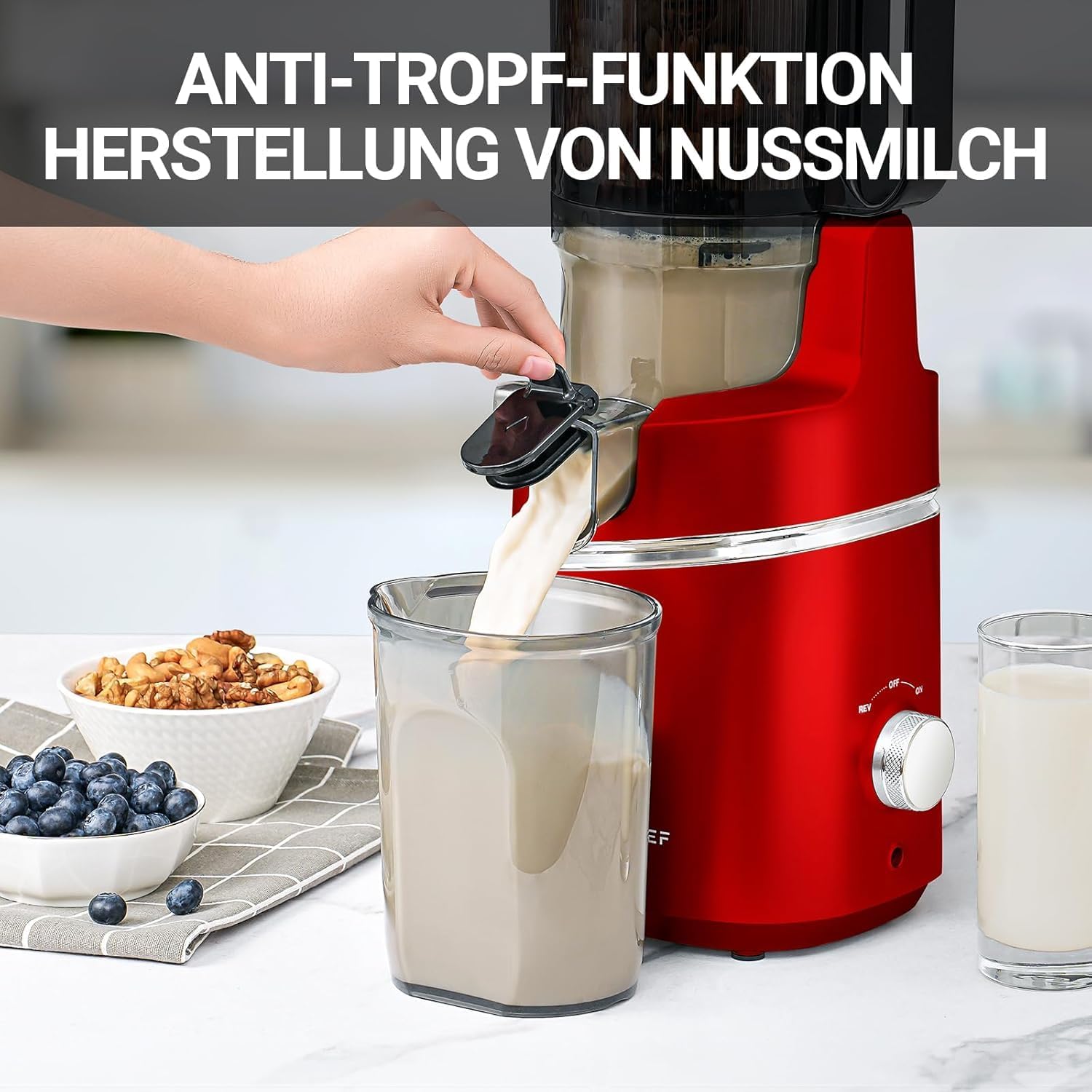 AMZCHEF 250 W автоматична сокоизстисквачка „всичко в едно“, отвор 145 мм и бавна сокоизстисквачка 1,8 л за зеленчуци и плодове, победител в теста за бавна сокоизстисквачка с троен филтър - наситено червена