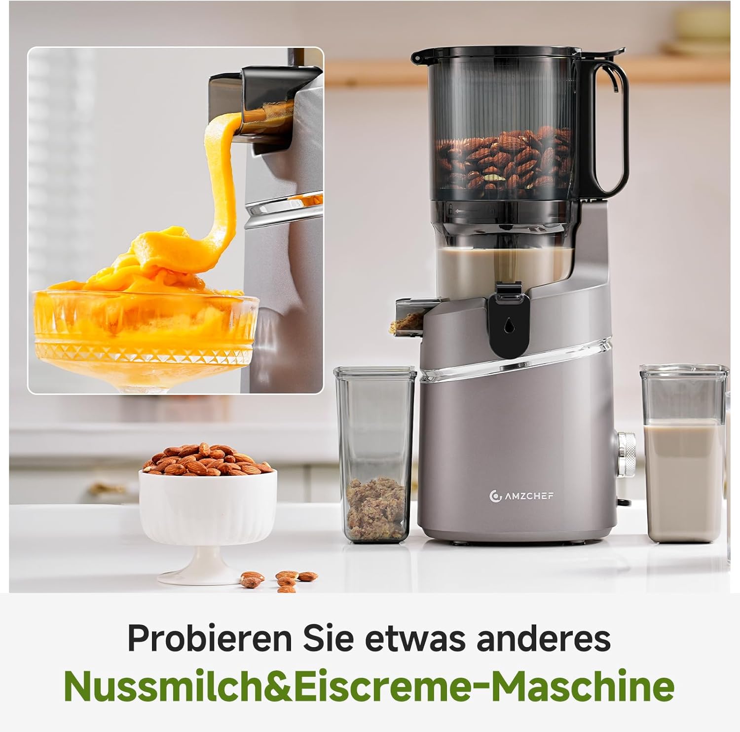 AMZCHEF 250 W автоматична сокоизстисквачка „всичко в едно“, отвор 145 мм и бавна сокоизстисквачка 1,8 л за зеленчуци и плодове, победител в теста за бавна сокоизстисквачка с троен филтър - сива