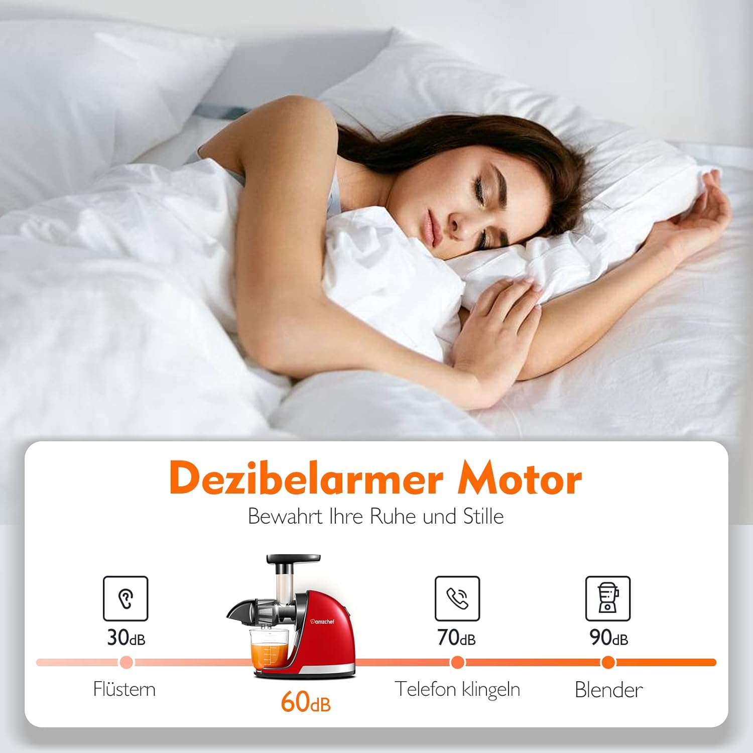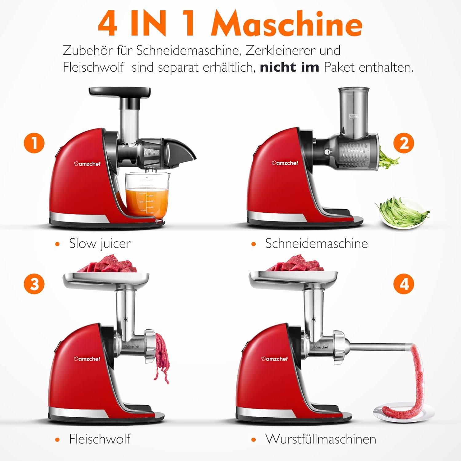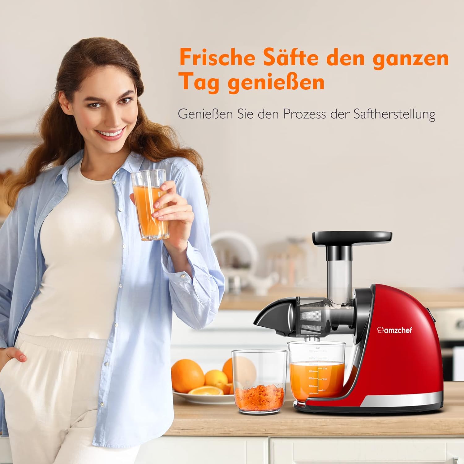 AMZCHEF Победител в теста за сокоизстисквачка за зеленчуци и плодове - Бавна сокоизстисквачка с функция за обратно дъвчене - Деликатно нарязване без филтри - Електрическа сокоизстисквачка с четка и 2 чаши - Червено червено