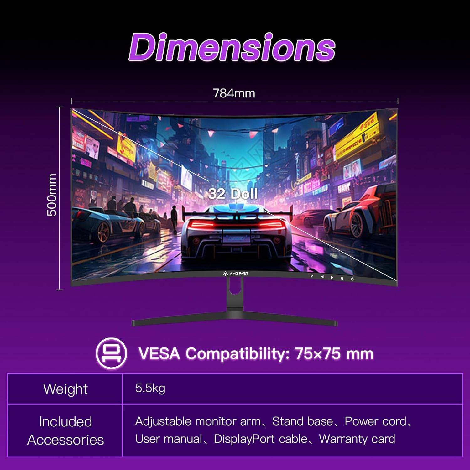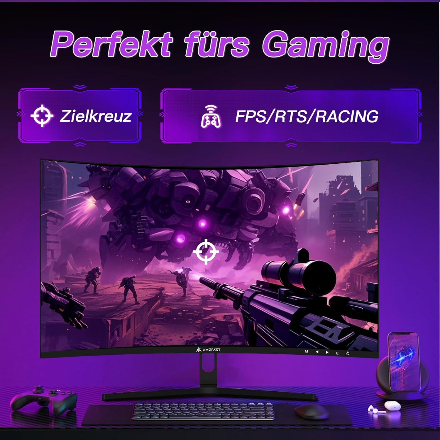 Amzfast 32-инчов извит геймърски монитор (240Hz, 1920x1080, 1ms MPRT, 1500R), адаптивна синхронизация, 90% DCI-P3, 120% sRGB, 300cd/m², HDMI 2.0 и DisplayPort 1.4 (AMZG32C3F)