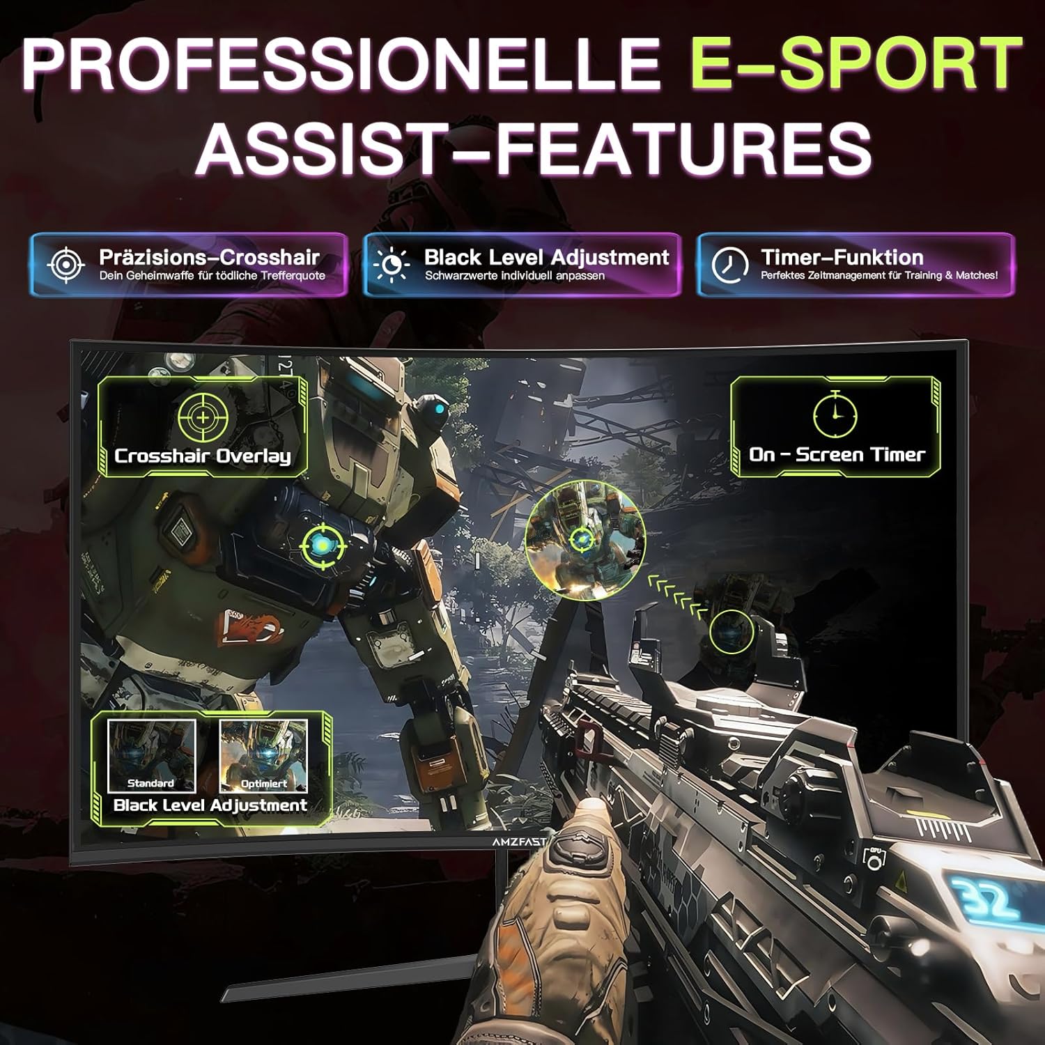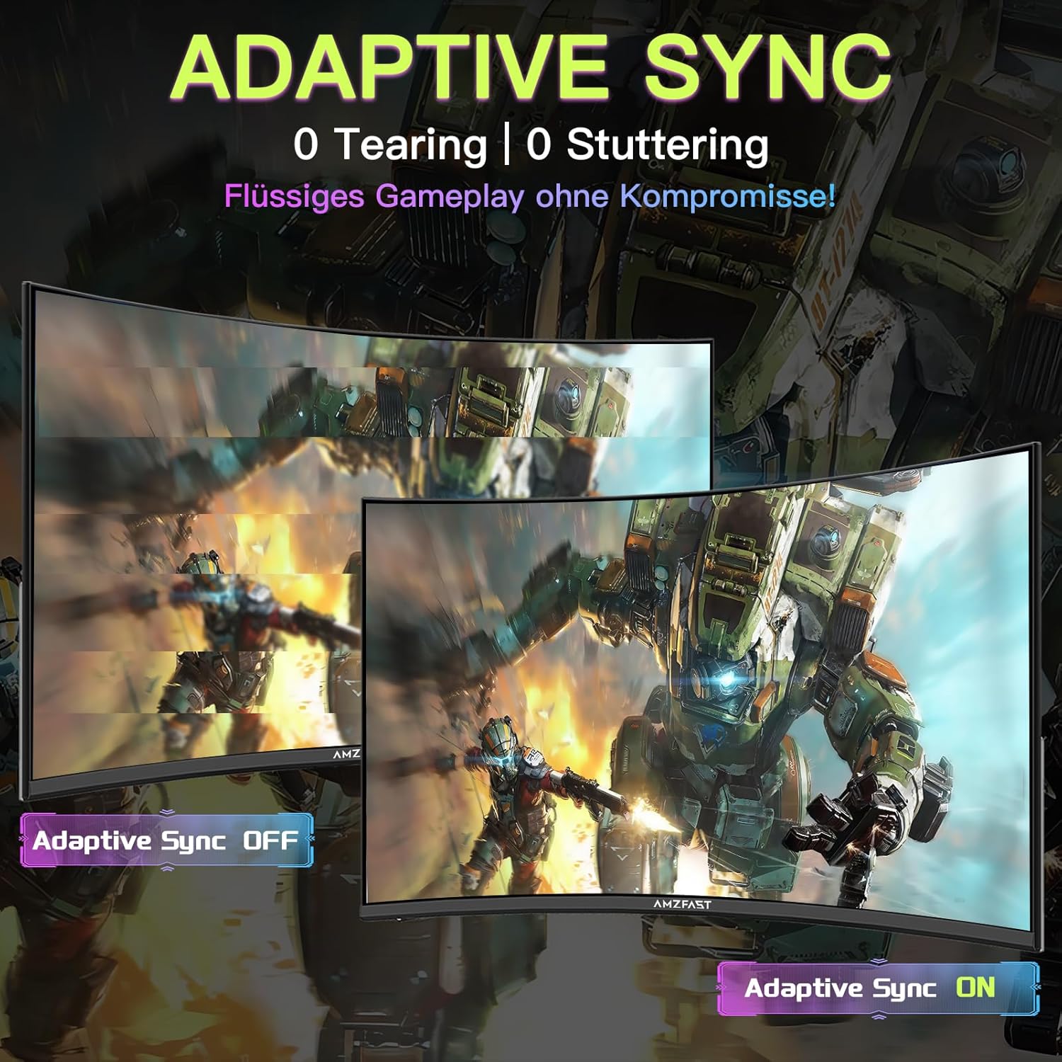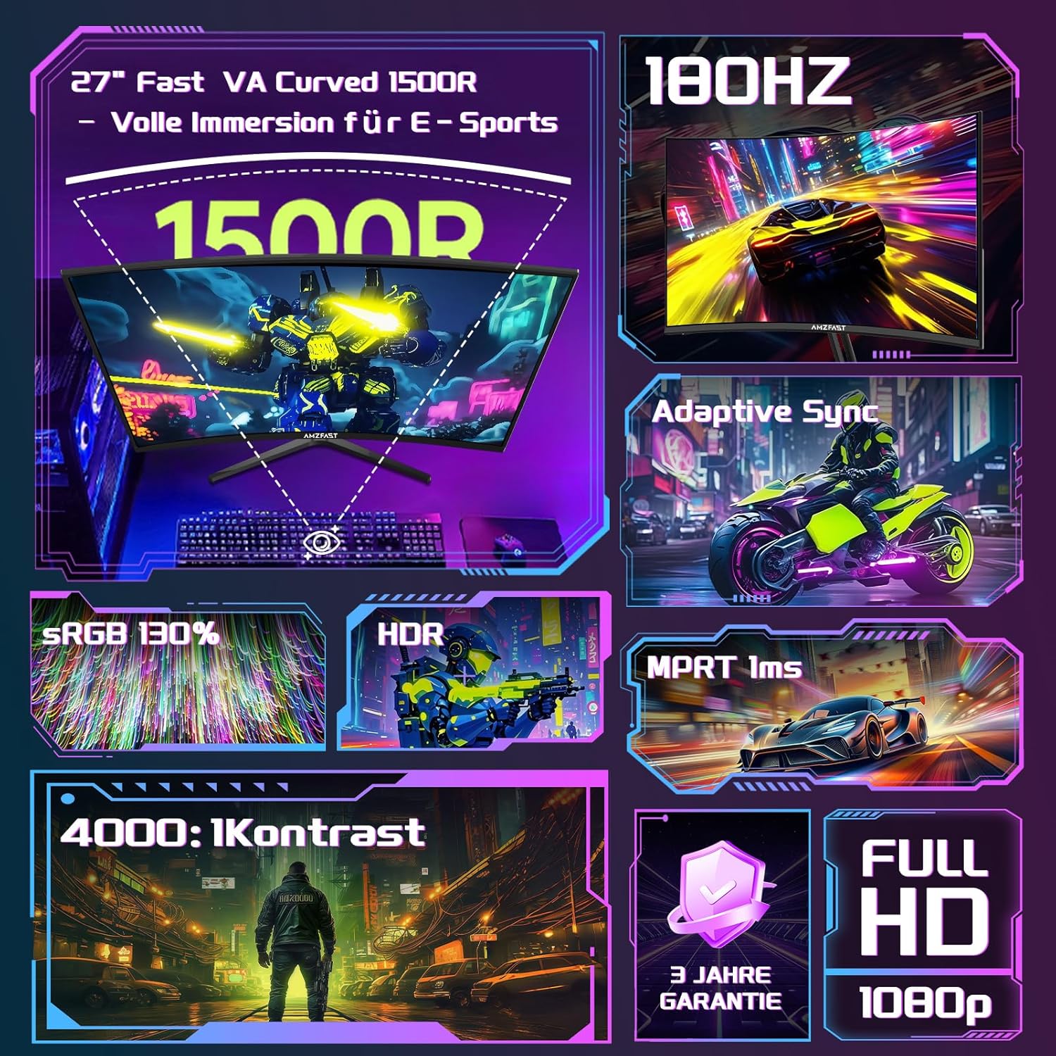 Amzfast AMZG27C1 27-инчов извит геймърски монитор - 180Hz, FHD (1920x1080), VA 1500R, 1ms GtG, sRGB 130%, DCI-P3 95%, HDR, Adaptive Sync, филтър за синя светлина, VESA 100 x 100, HDMI 1.4/DP 1.2 с HDMI кабел