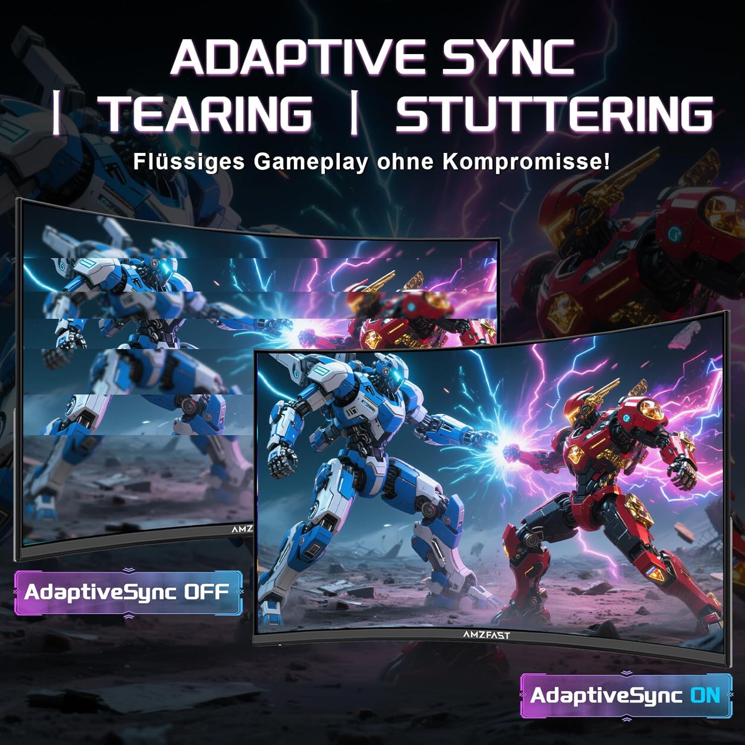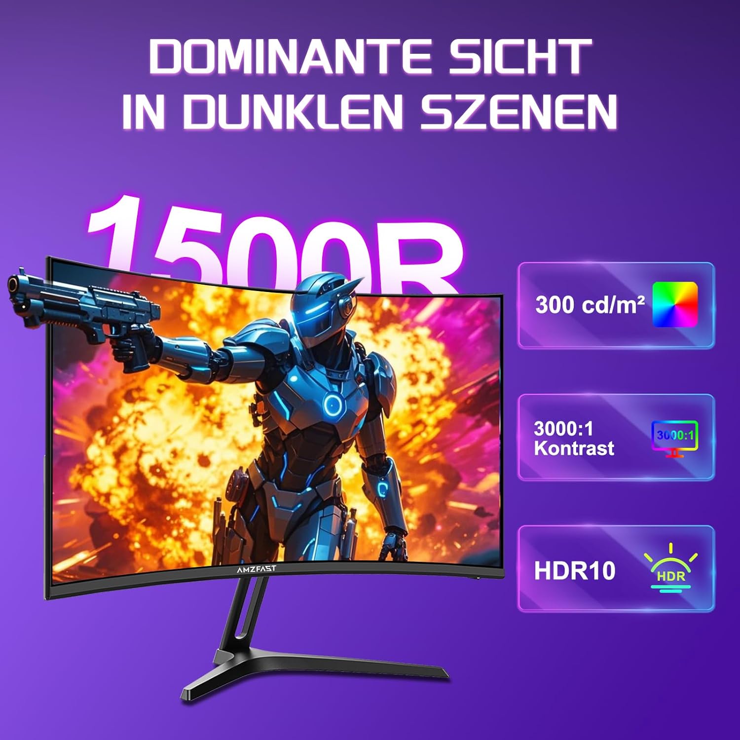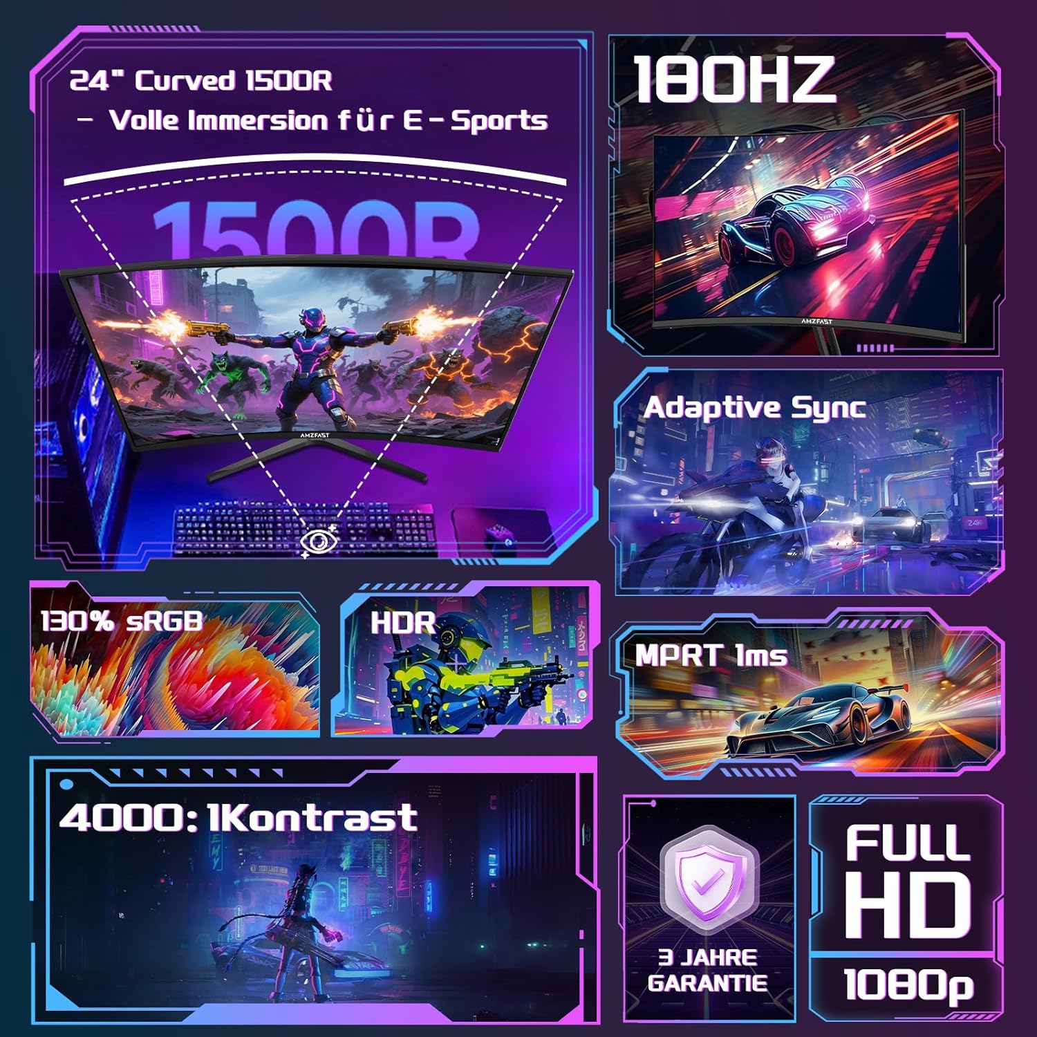 Amzfast Геймърски монитор с извивка 24 инча - 180Hz, FHD 1920 x 1080, филтър на синя светлина, 1 ms MPRT, адаптивна синхронизация, sRGB 130% / DCI-P3 97%, HDMI 1.4 + DP 1.2, VESA 75 x 75, AMZG24C1