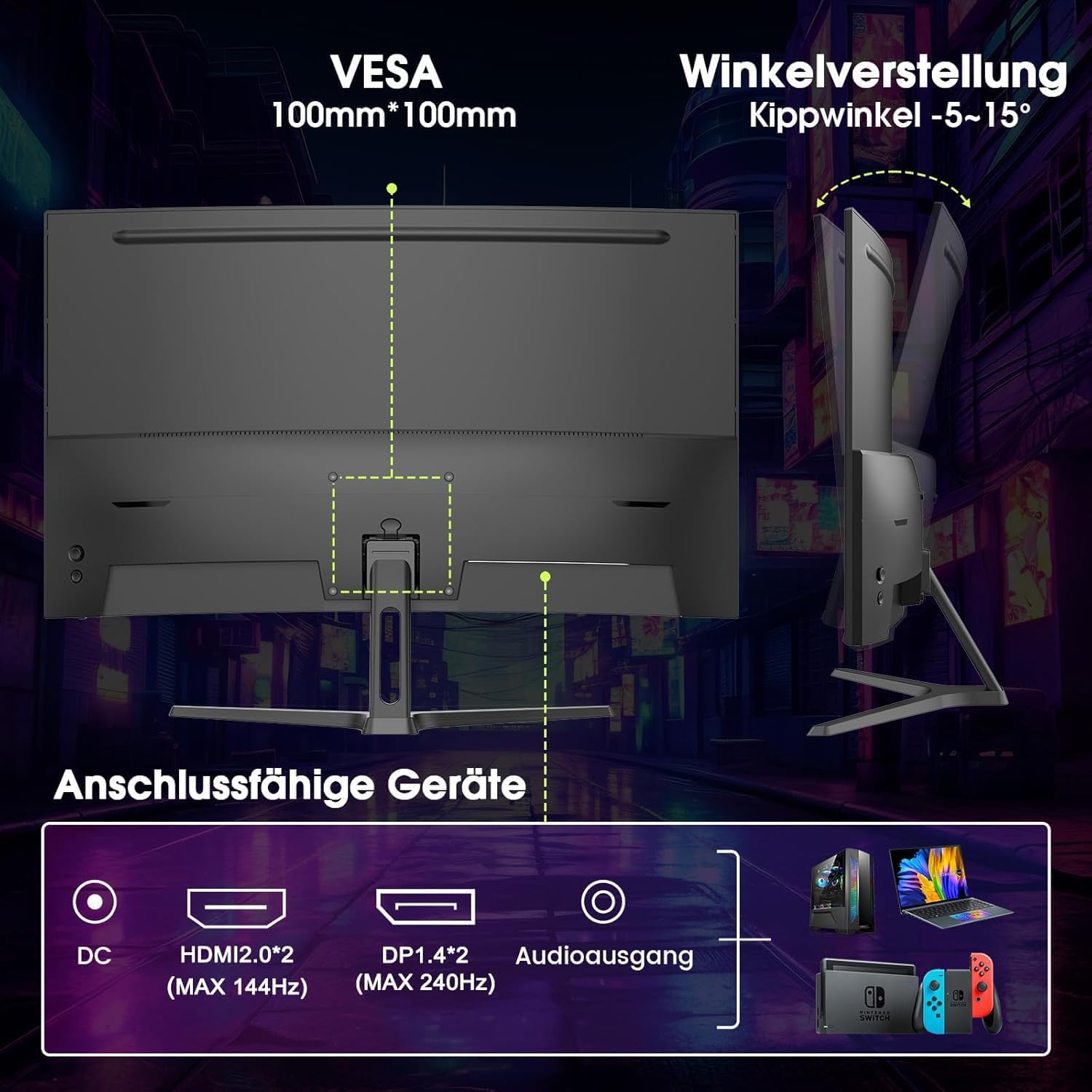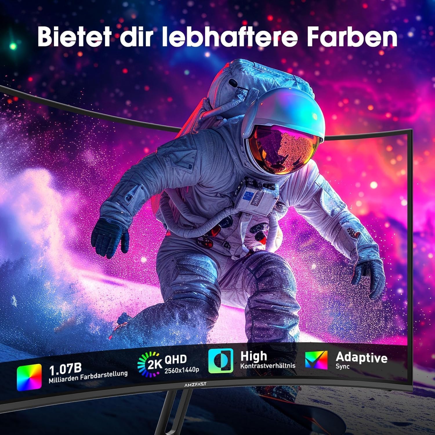 Amzfast Извит геймърски монитор 27 инча - 240Hz, QHD 2560x1440, 1ms MPRT, адаптивна синхронизация, 1500R извивка HDR10, 90% DCI-P3, HDMI 2.0x2, DP 1.4x2, VESA, филтър за синя светлина, AMZG27C1Q Pro