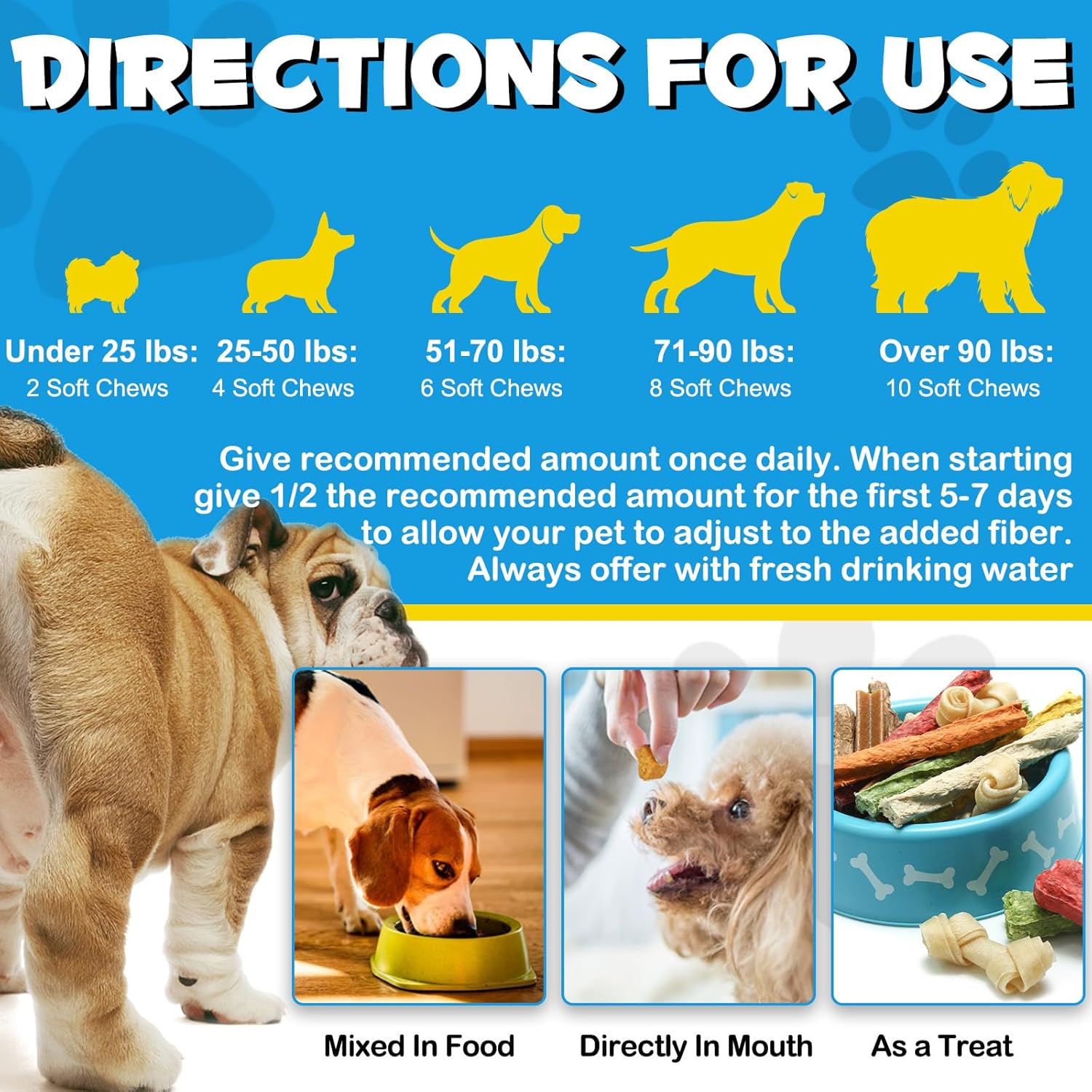 • Препоръчва се дневна доза. Първоначално се препоръчва само половината от препоръчителната доза през първите 5-7 дни, за да може тялото да се адаптира към добавените фибри. Винаги е на разположение прясна питейна вода.