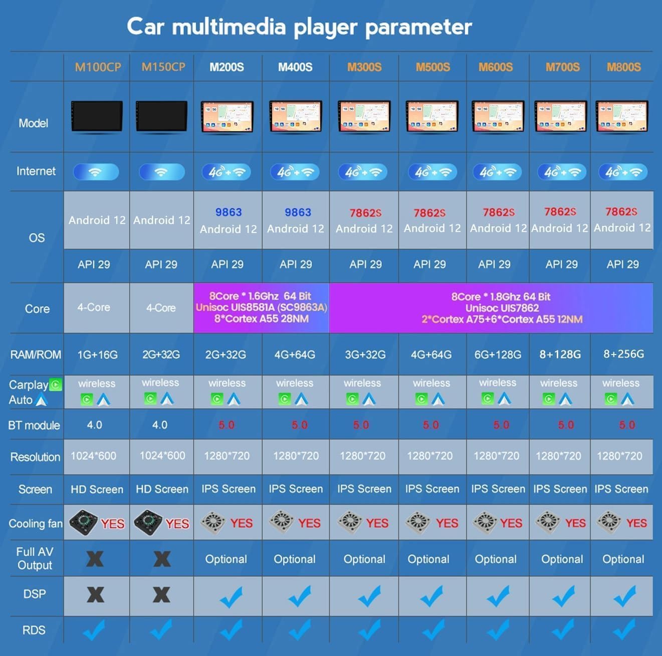 • Конфигурация на радиото: 9-инчов HD сензорен екран с резолюция 1280 x 720. Най-новата система Android 13 или Android 14. Ефективен четириядрен процесор: (4-ядрен Wi-Fi 1+32GB, 4-ядрен Wi-Fi 2+32GB). Осемядрен процесор: (8-ядрен 4G WiFi 2+32GB, 8-ядрен 4G WiFi 4+64GB, 8-ядрен 4G WiFi 8+128GB, 8-ядрен 4/5G WiFi 8+256GB), (M100CP 150CP не поддържа резолюция 1280 x 720).