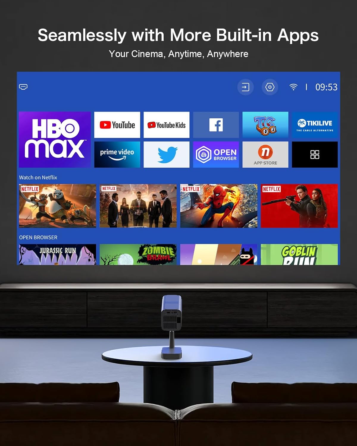 Android TV OS и телескопична стойка: Puxinat Smart Projector с WiFi 6 и Bluetooth 5.2, 300ANSI електрически фокус/автоматично трапецовидно изкривяване 1080P мини проектор с регулируема на 180° стойка, YouTube/HBO за използване с едно щракване