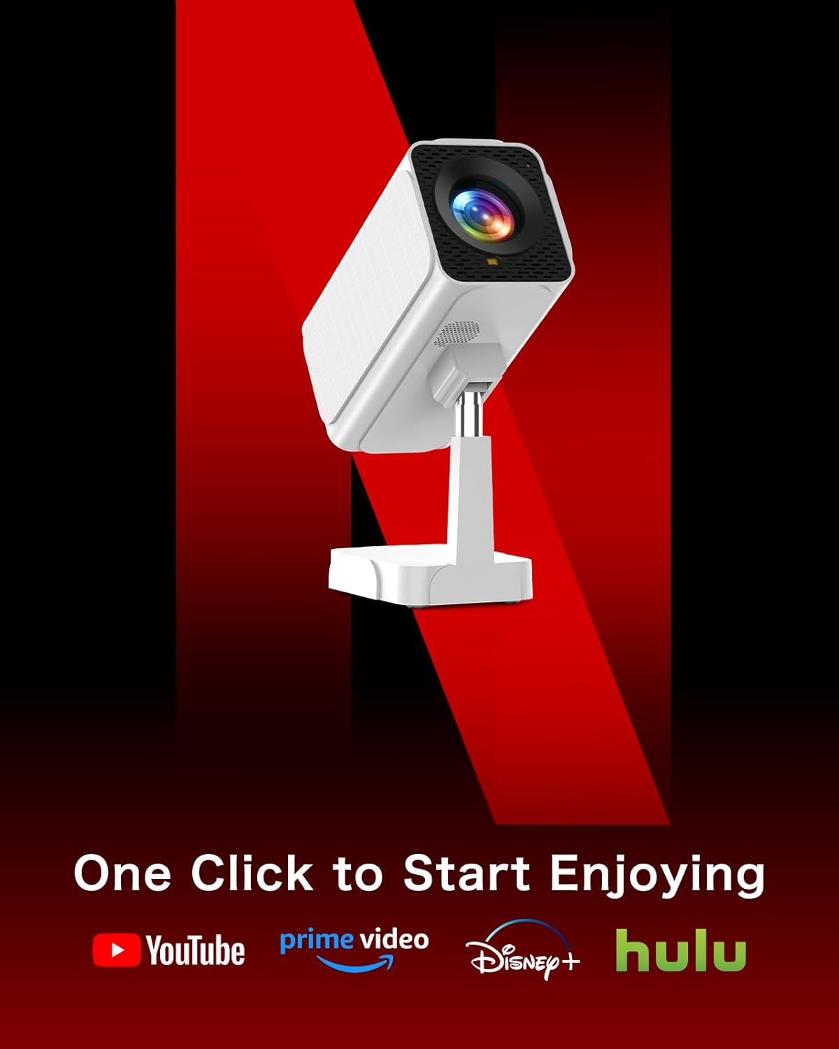 • Bluetooth свързаност: С обновения вграден високоговорител можете да се насладите на аудиовизуално кино изживяване, без да свързвате външни високоговорители. Освен това, този преносим проектор, интегриран с технологията Bluetooth 5.2, прави синхронизацията на звука по-бърза и по-стабилна. С този Bluetooth проектор можете безжично да свържете идеалните си Bluetooth високоговорители или Bluetooth слушалки по всяко време, за да постигнете по-прекрасен звук. Забележка: Bluetooth връзката е само за предаване на звук с аудио устройства (Bluetooth високоговорители или Bluetooth слушалки), които не могат да се използват за отразяване на екрана на смартфон.