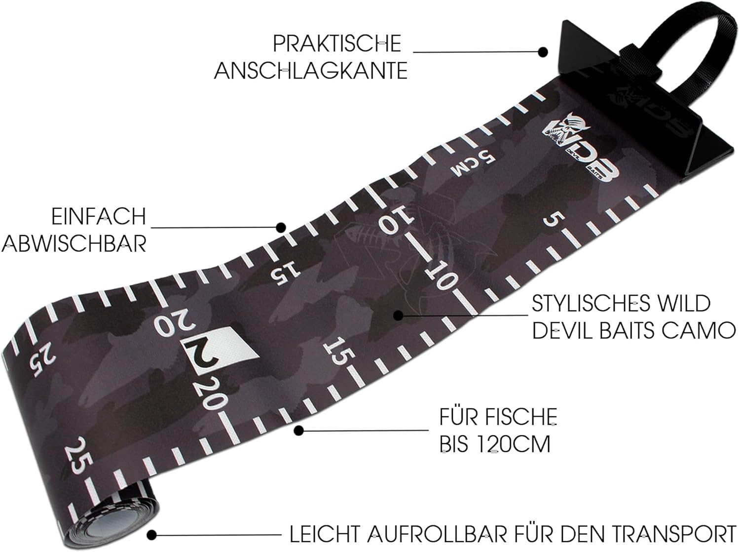Ролетната скала Wild Devil Baits Rollup Measure Scale 120 е идеална за вашите мобилни и най-вече гъвкави риболовни пътувания. Независимо дали става въпрос за бяла риба, костур или щука, с тази ролетка вашият улов може да бъде измерен бързо.