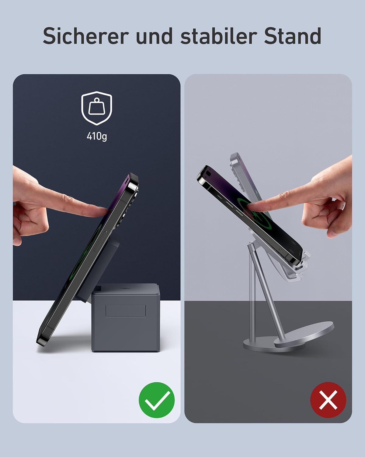 • Регулируем ъгъл: Наклон до 60° за гъвкаво използване на iPhone в портретен или пейзажен режим по време на зареждане, за максимална преносимост - използвайте го като индуктивно зарядно за iPhone.