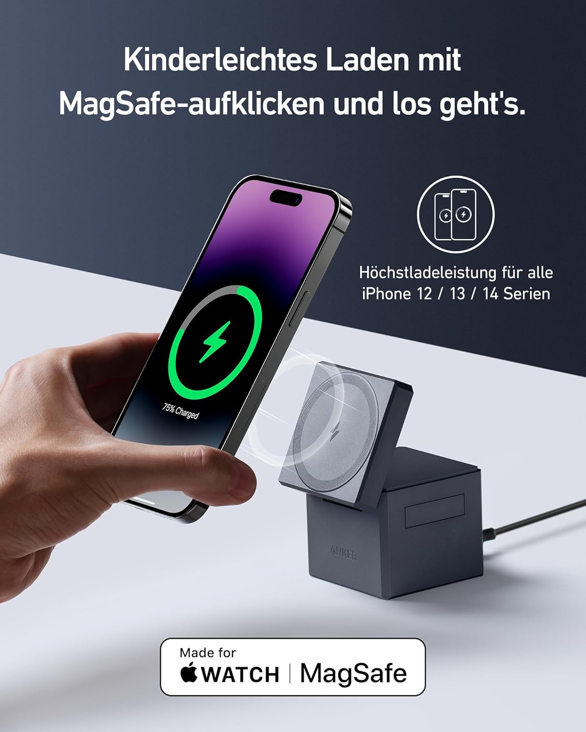 Anker 3-в-1 Cube със зарядна станция MagSafe, 15 W безжично зарядно за iPhone, индуктивна зарядна станция за Apple Watch и iPhone 16/15/14/13/12, AirPods Pro/3/2 (включва 30 W зарядно)