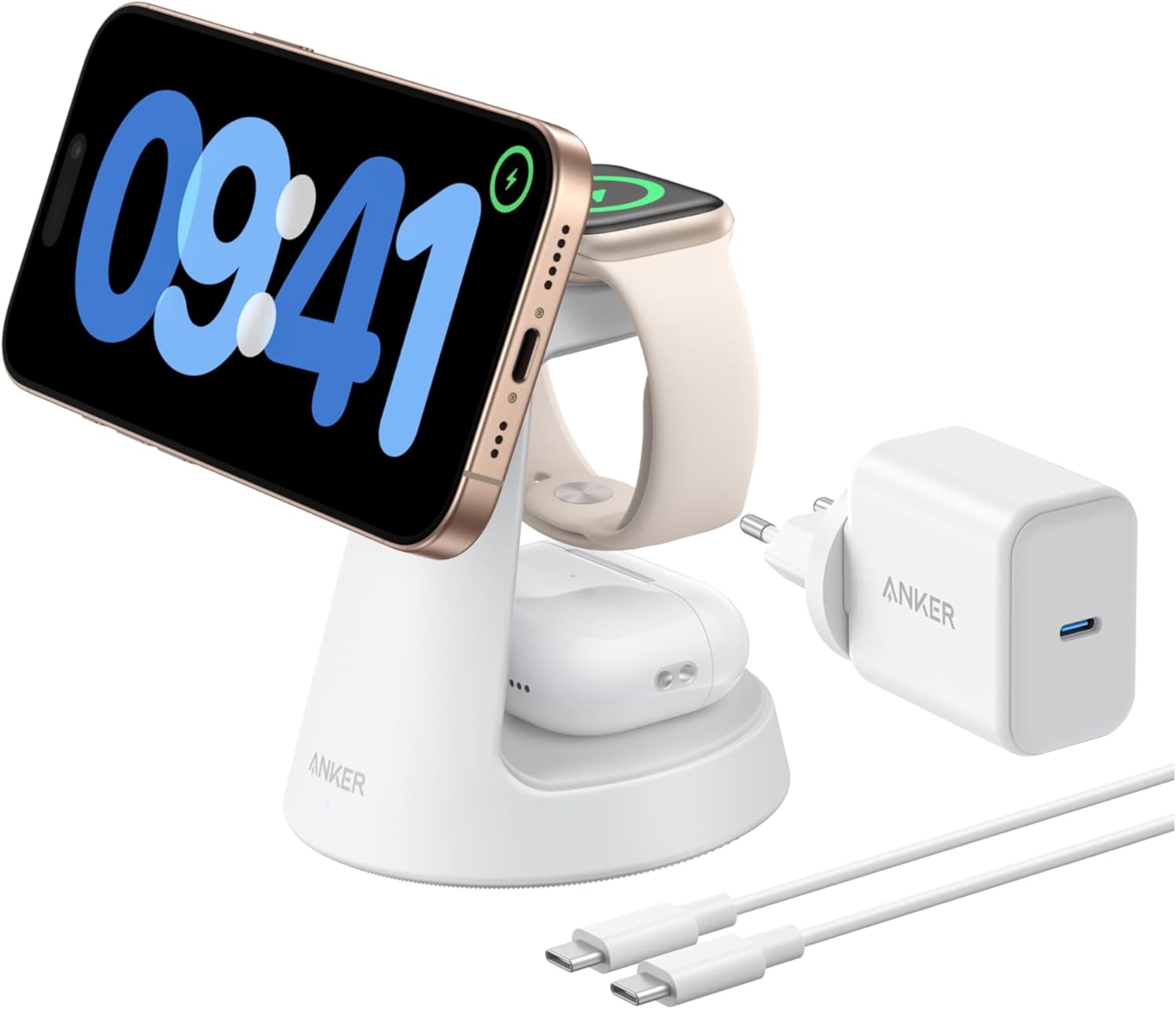 • Съдържание на кутията: Безжична зарядна станция Anker MagGo (3 в 1, стойка), 40 W USB-C адаптер, 1,5 м USB C към USB-C кабел, ръководство за бърз старт.