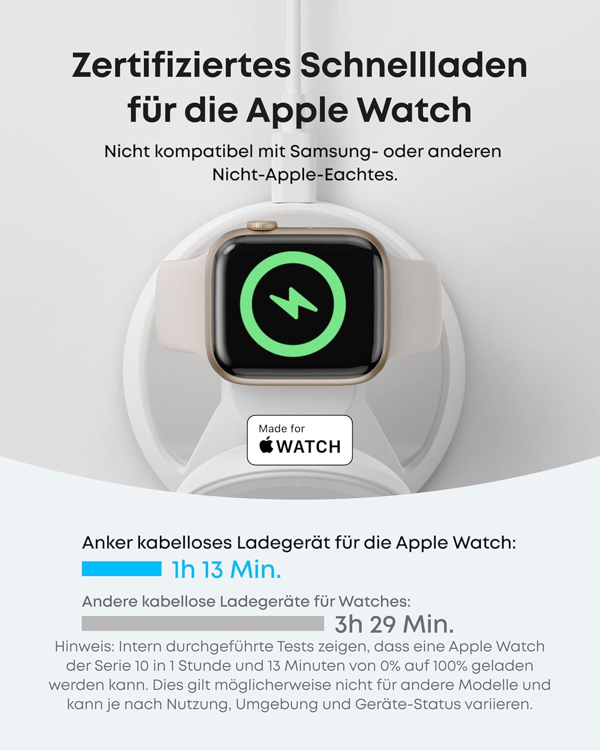• Сертифицирано бързо зареждане за Apple Watch: Официално сертифицираното зарядно устройство зарежда вашия Apple Watch Series 9 до 100% само за 73 минути.