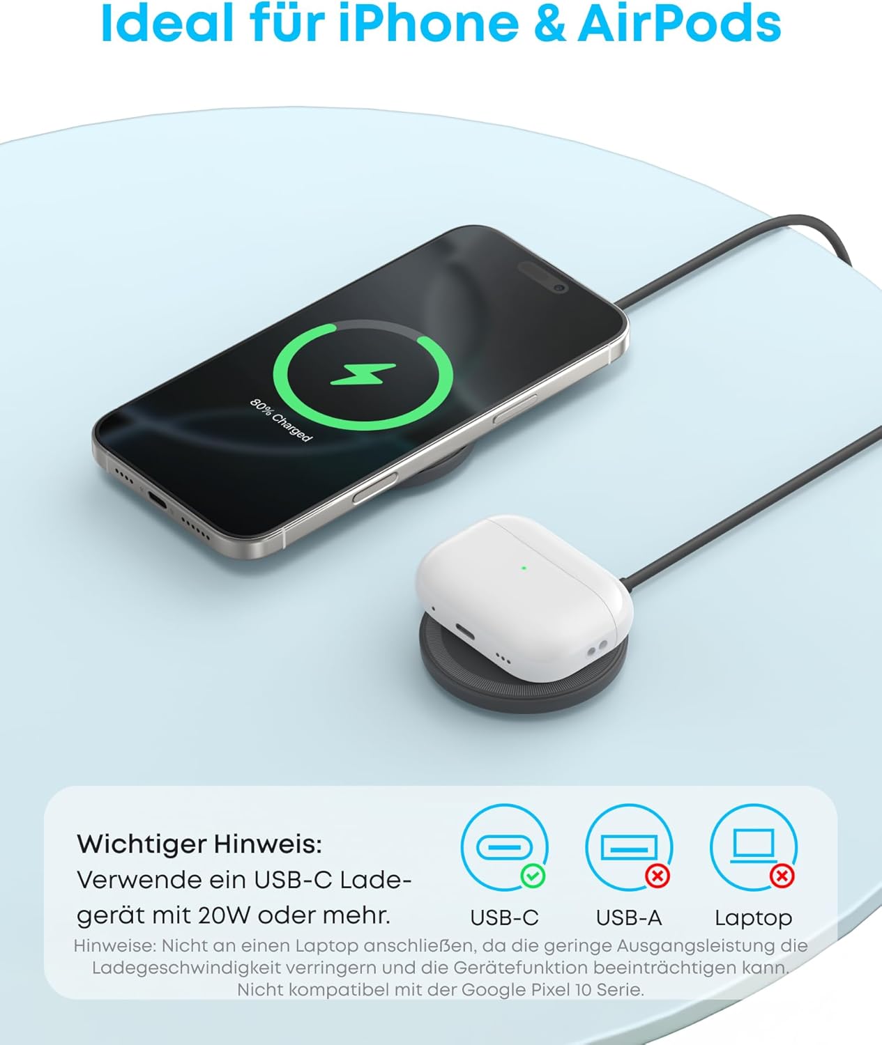 Anker Zolo Magnetic Wireless Charging Pad - комплект от 2 броя, Qi2 сертифициран, 15W, MagSafe, съвместим с iPhone 17/16/15/14/13 Series, AirPods и др. (Не е за Pixels, без захранване)