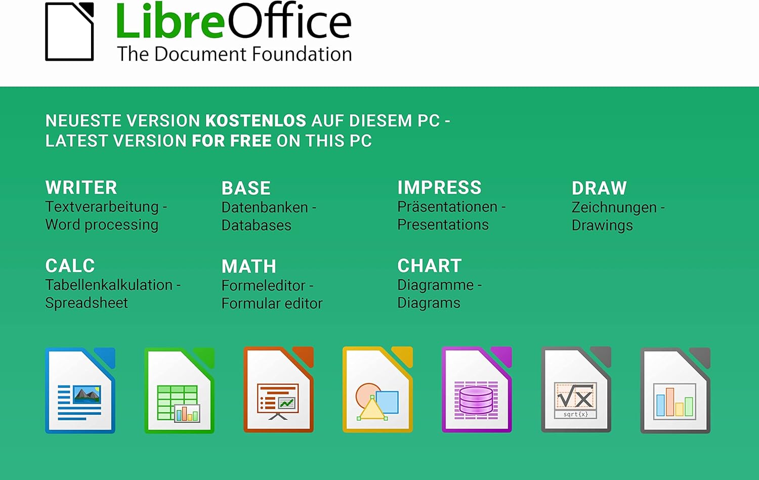 Als Office-Lösung installieren wir Dir das LibreOffice-Paket mit Writer / Calc / Impress / Draw / Base / Math.