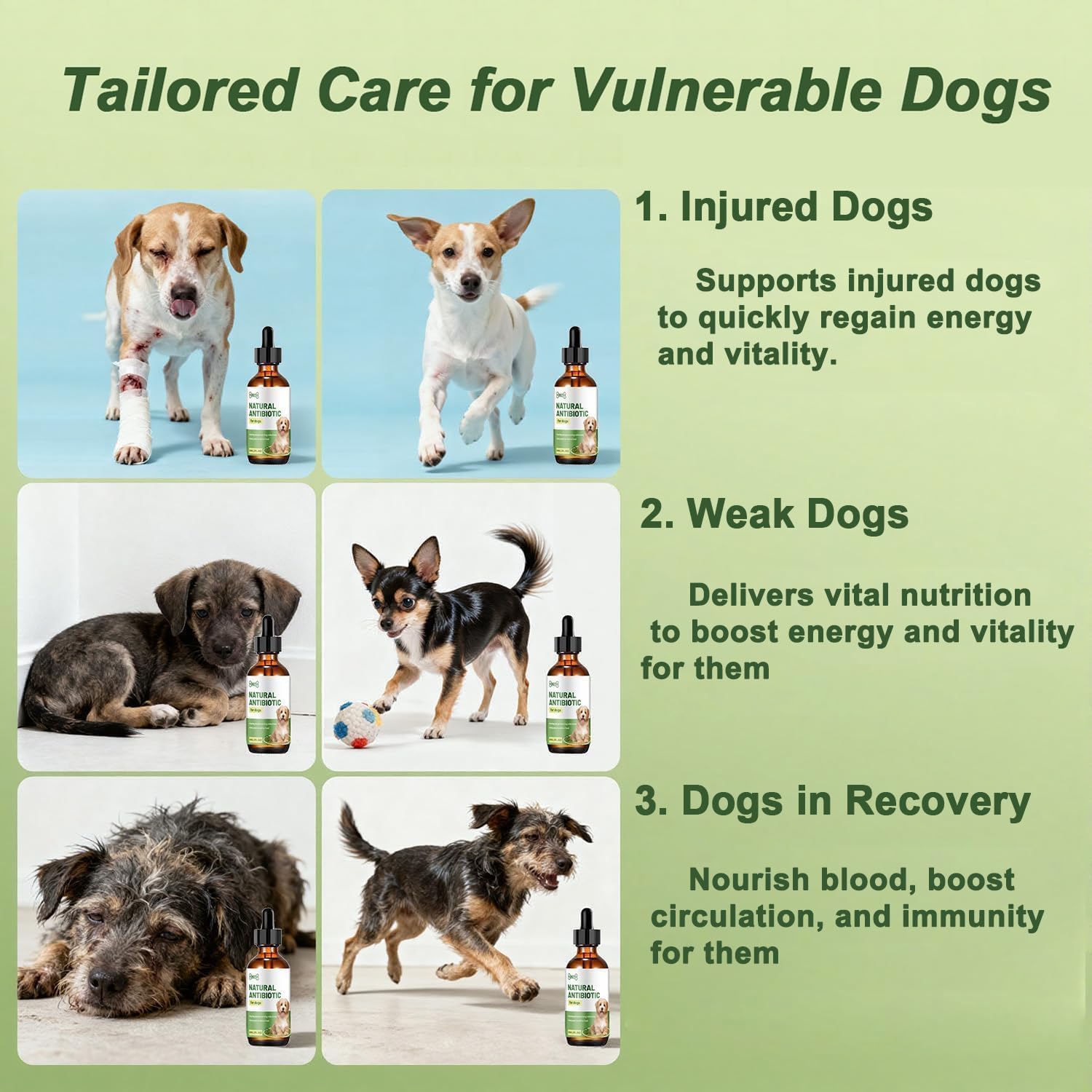 • Възстановяване на жизнеността при кучетата: Независимо дали става въпрос за кученце по време на кърмене, по-възрастно куче с отслабена имунна система, куче, възстановяващо се от болест, нараняване или операция, женско куче след раждане или здраво куче – това може да им помогне да възвърнат жизнеността си, да подобри храненето им, да ускори възстановяването и да им осигури любяща грижа.