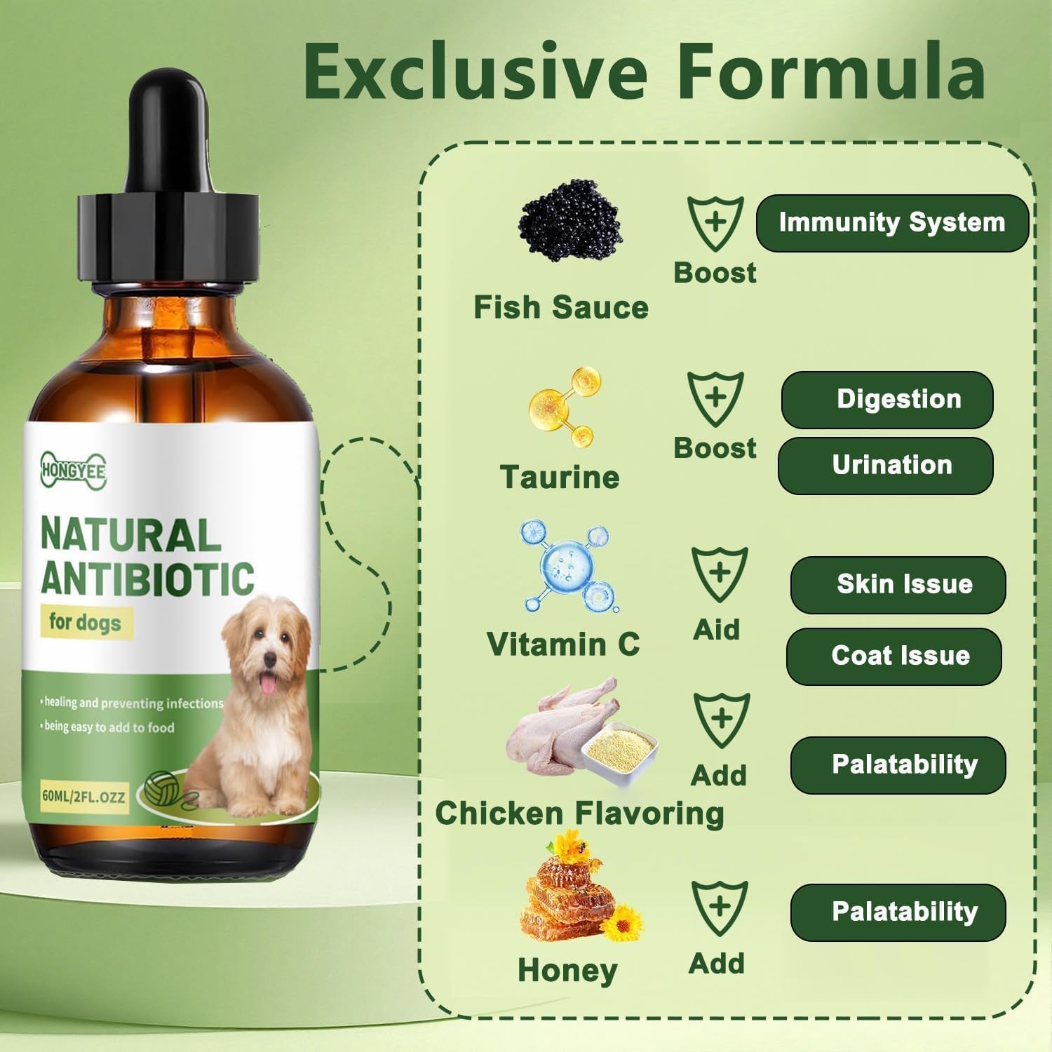 • Естествено хранене за слаби и възстановяващи се кучета: Произведено от екстракти от растения като орлови нокти, астрагал, рибен жълтък, ангелика, чуансюн, рибен сос, таурин, L-аскорбинова киселина, подправка за пиле и мед – без изкуствени добавки или консерванти. Нежно поддържа естествената, здравословна диета на кучето.