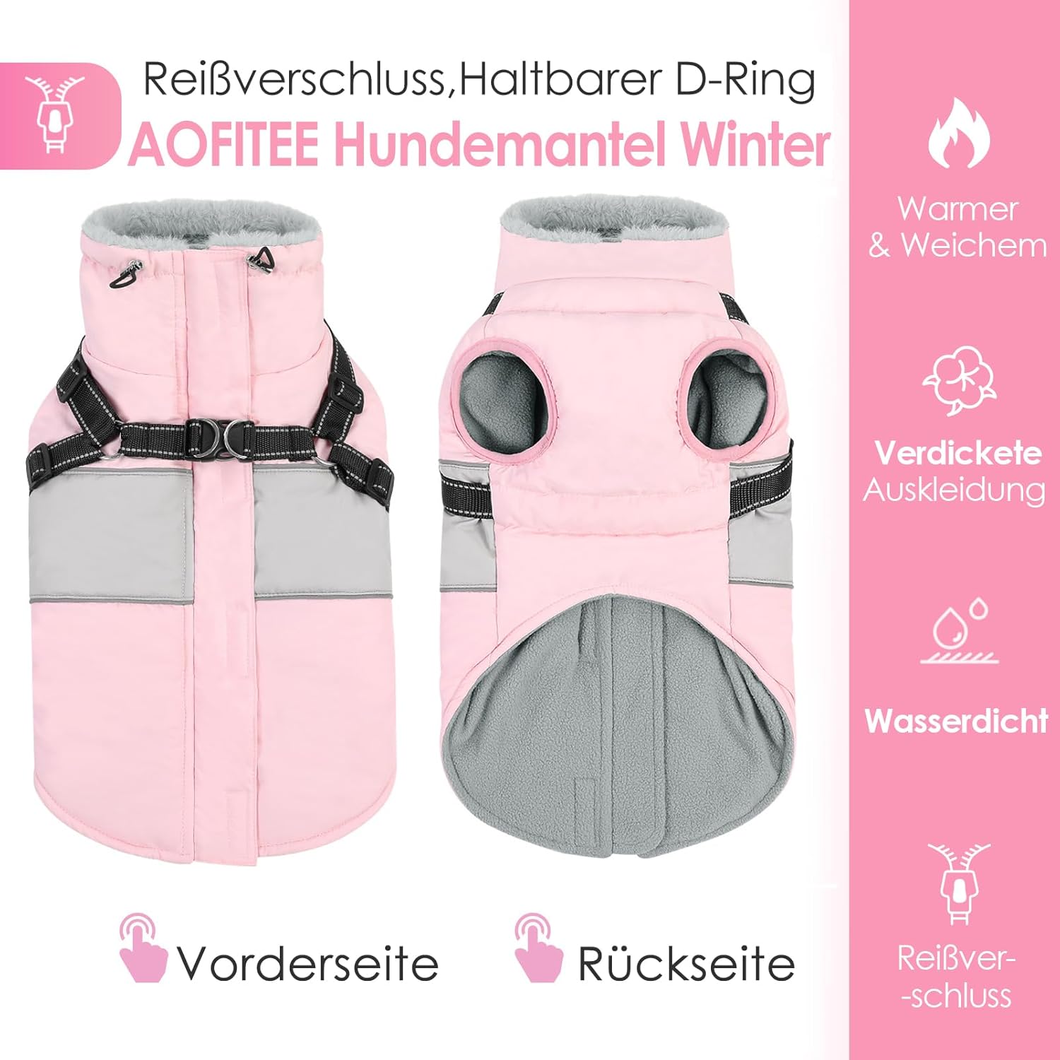 AOFITEE Яке за кучета за големи кучета, Водоустойчиво зимно палто за кучета с хамут за големи кучета, Топло палто за кучета, полар, зимни палта, дрехи за кучета, снежен костюм за френски булдог, розово, размер L