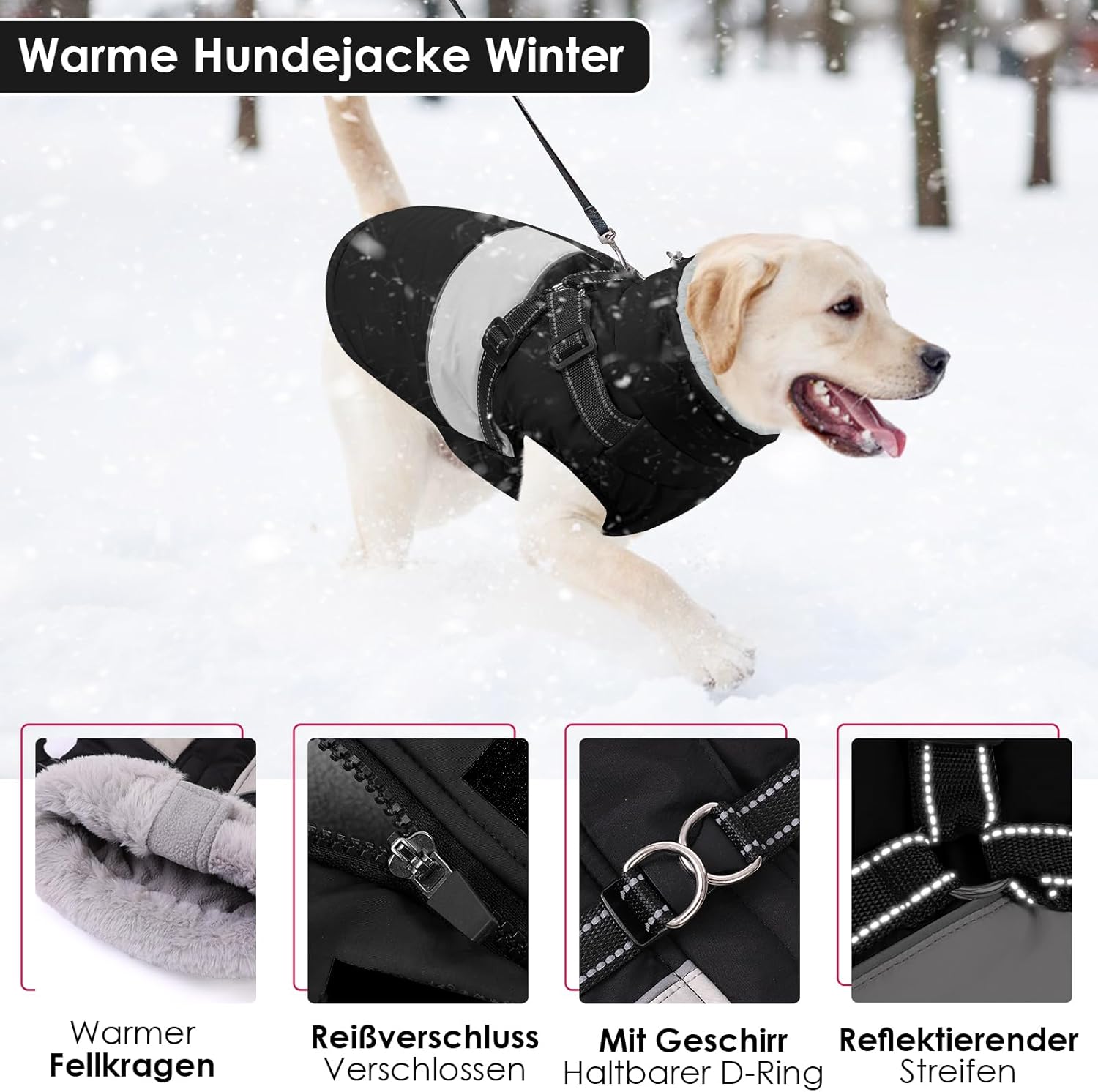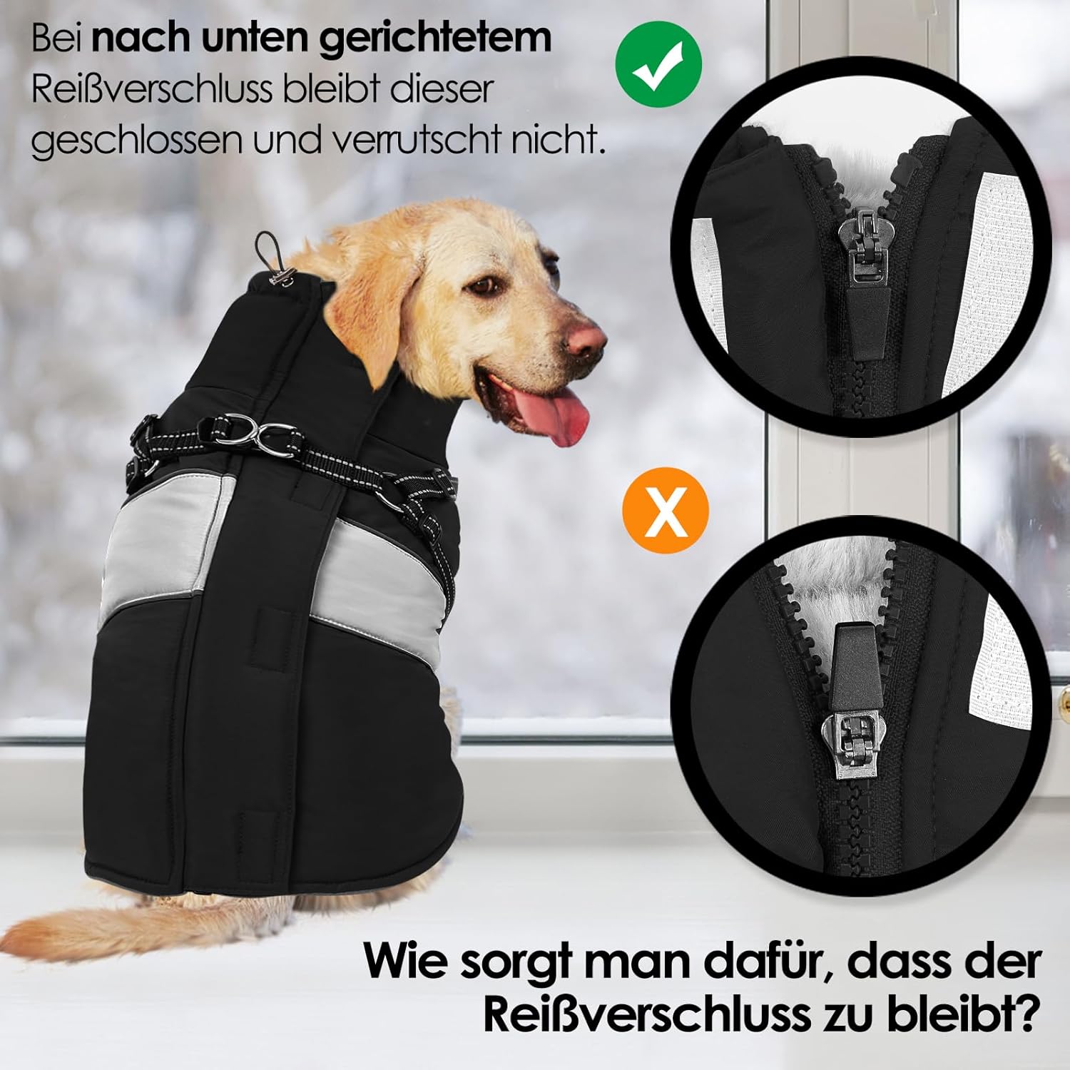 • Светлоотразително палто за кучета със защита на корема: това топло зимно палто с еластична гръдна област осигурява перфектно прилягане. Светлоотразителните ленти за безопасност на нашите зимни палта за кучета увеличават видимостта през нощта и защитават безопасността на вашето куче.