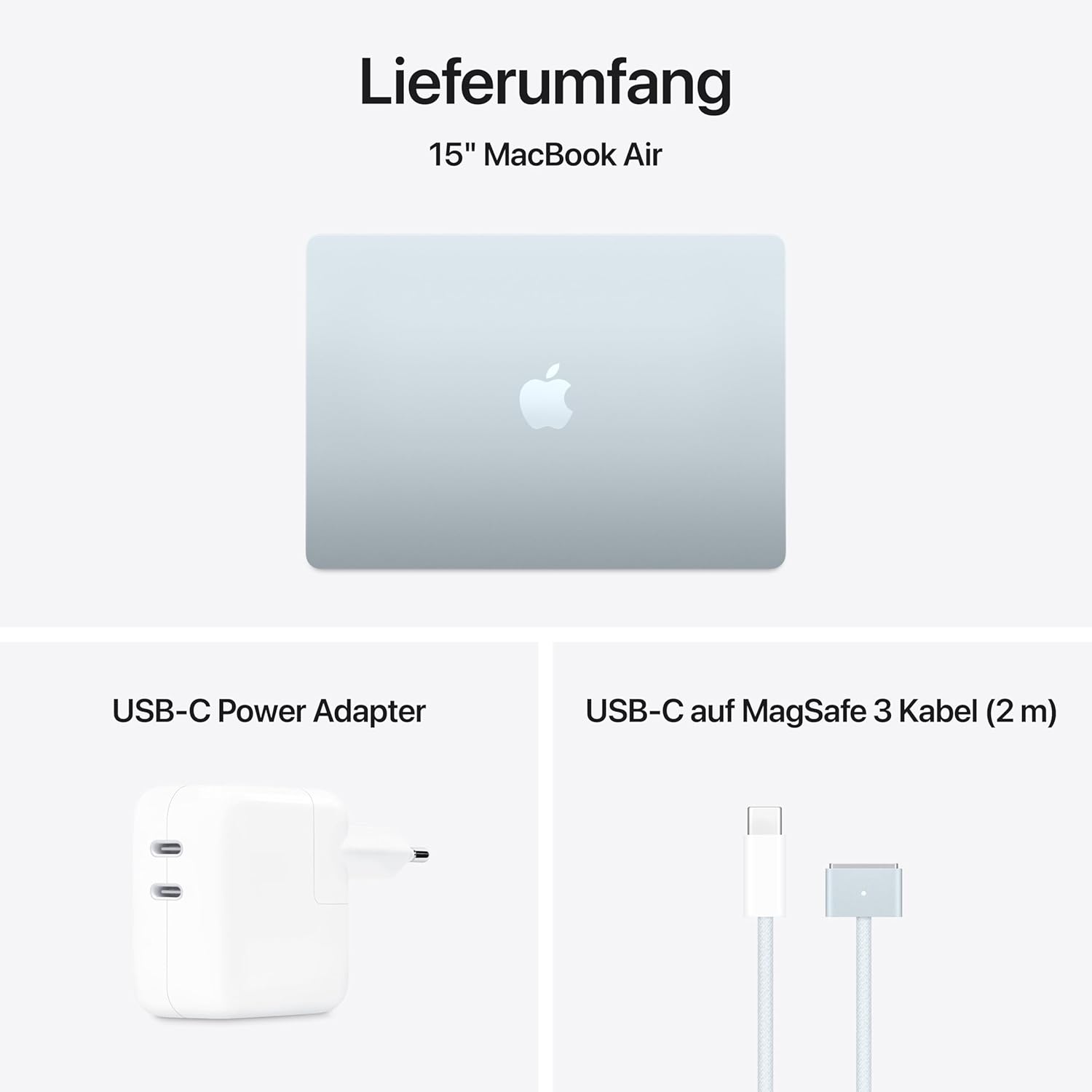 Apple MacBook Air (15 инча, Apple M4 чип с 10-ядрен процесор и 10-ядрен графичен процесор, 16GB споделена памет, 256GB) - небесно син