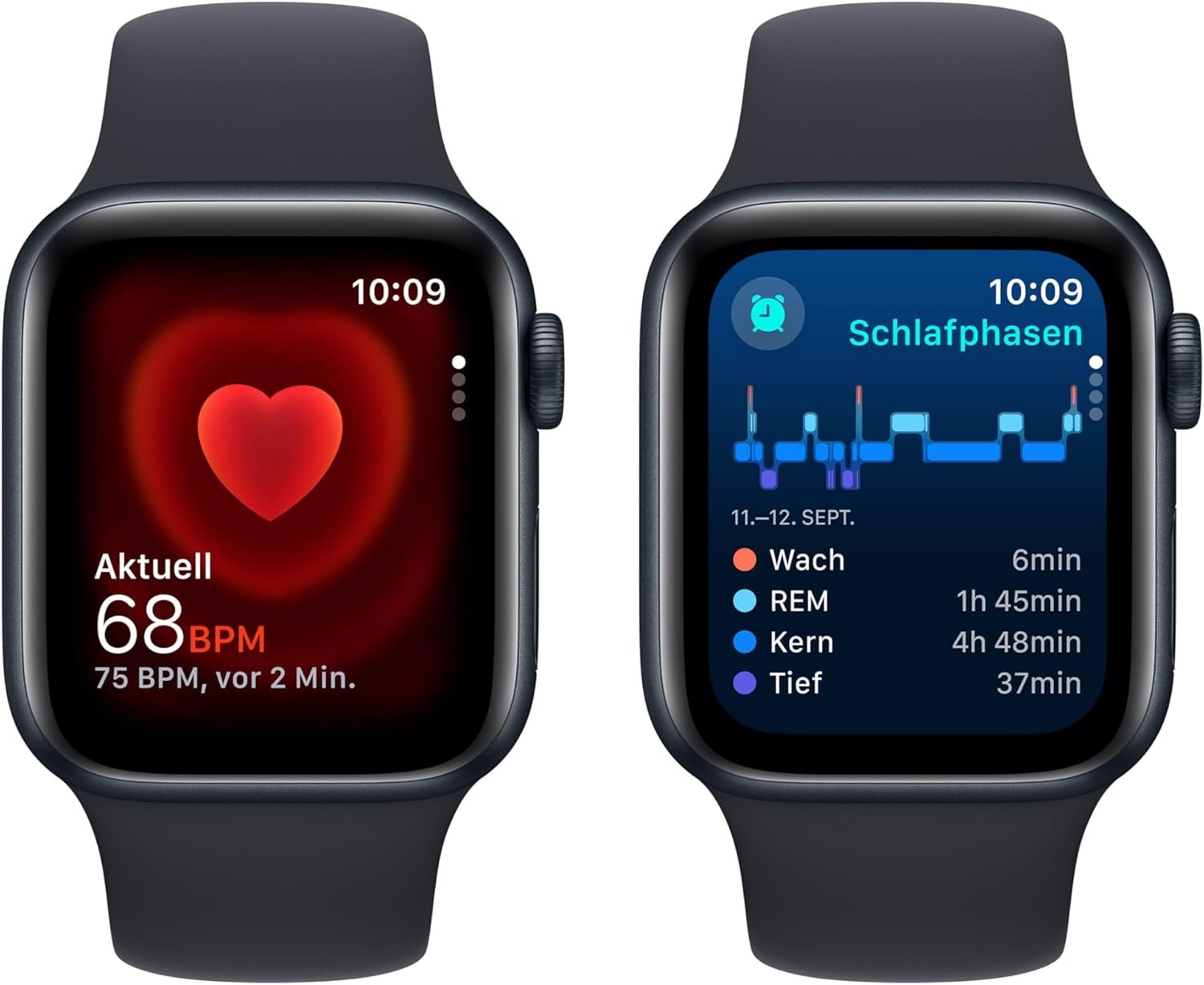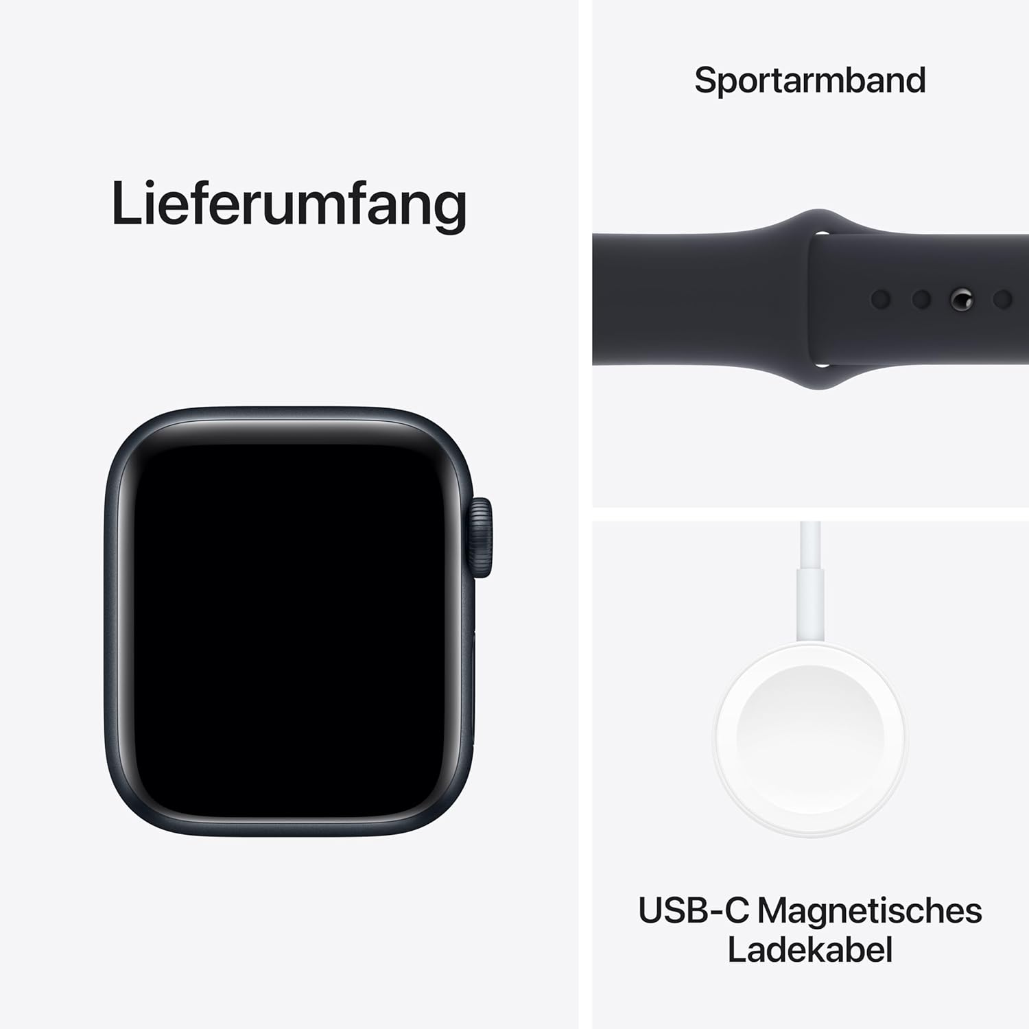 Apple Watch SE (2-ро поколение, 2023) (GPS, 40 мм) смарт часовник с алуминиев корпус и спортна каишка (S/M), в цвят Midnight, фитнес и сън тракер, разпознаване на сблъсък, пулсомер, Retina дисплей