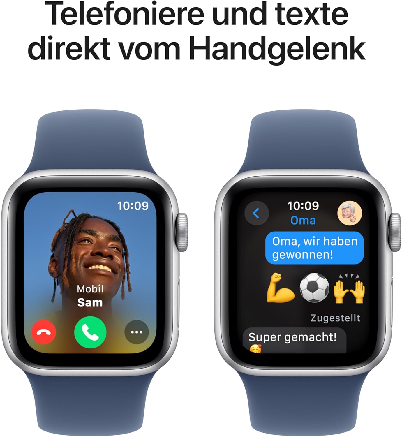 Apple Watch SE (2-ро поколение) GPS 40 мм смарт часовник с алуминиев корпус в сребристо и дънкова спортна каишка (M/L) Фитнес и проследяване на съня, откриване на инциденти, пулсомер, Retina дисплей