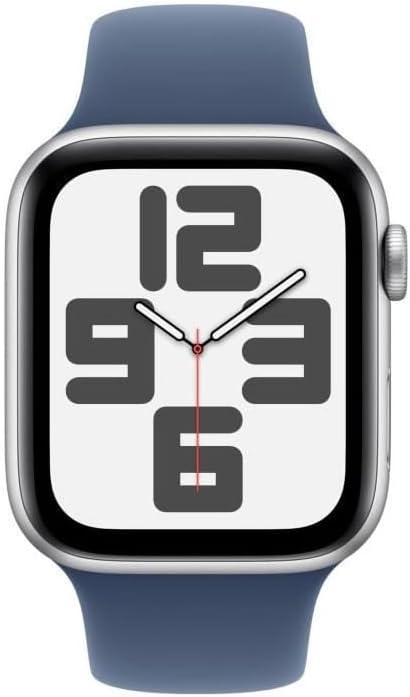 Apple Watch SE (2-ро поколение) GPS 44 мм смарт часовник с алуминиев корпус в сребристо и дънкова спортна каишка (M/L) Фитнес и проследяване на съня, откриване на инциденти, пулсомер, Retina дисплей