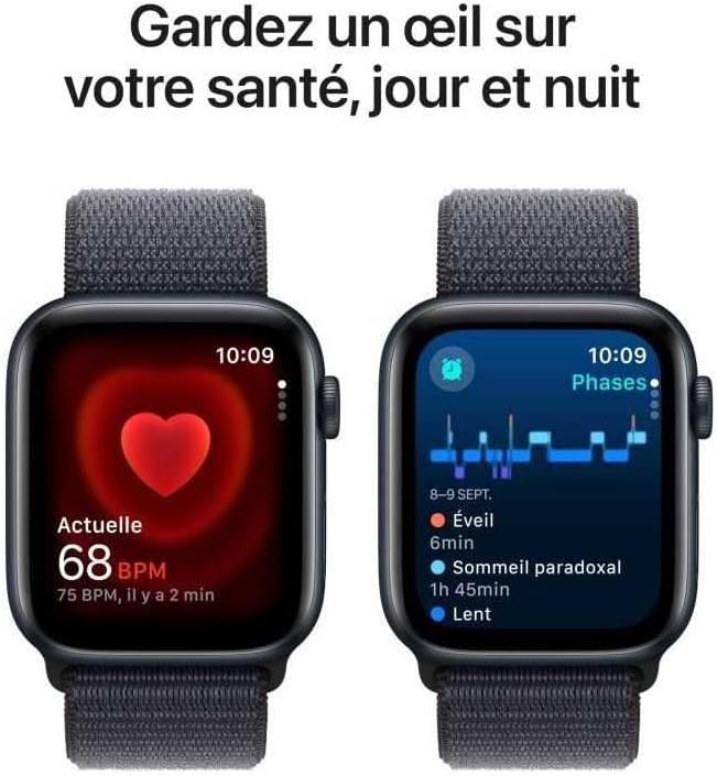 Apple Watch SE (2-ро поколение) GPS 44 мм смарт часовник с корпус от алуминий Midnight и спортна каишка в цвят Ink (един размер) Фитнес и проследяване на съня, разпознаване на инциденти, пулсомер, CO₂ неутрален