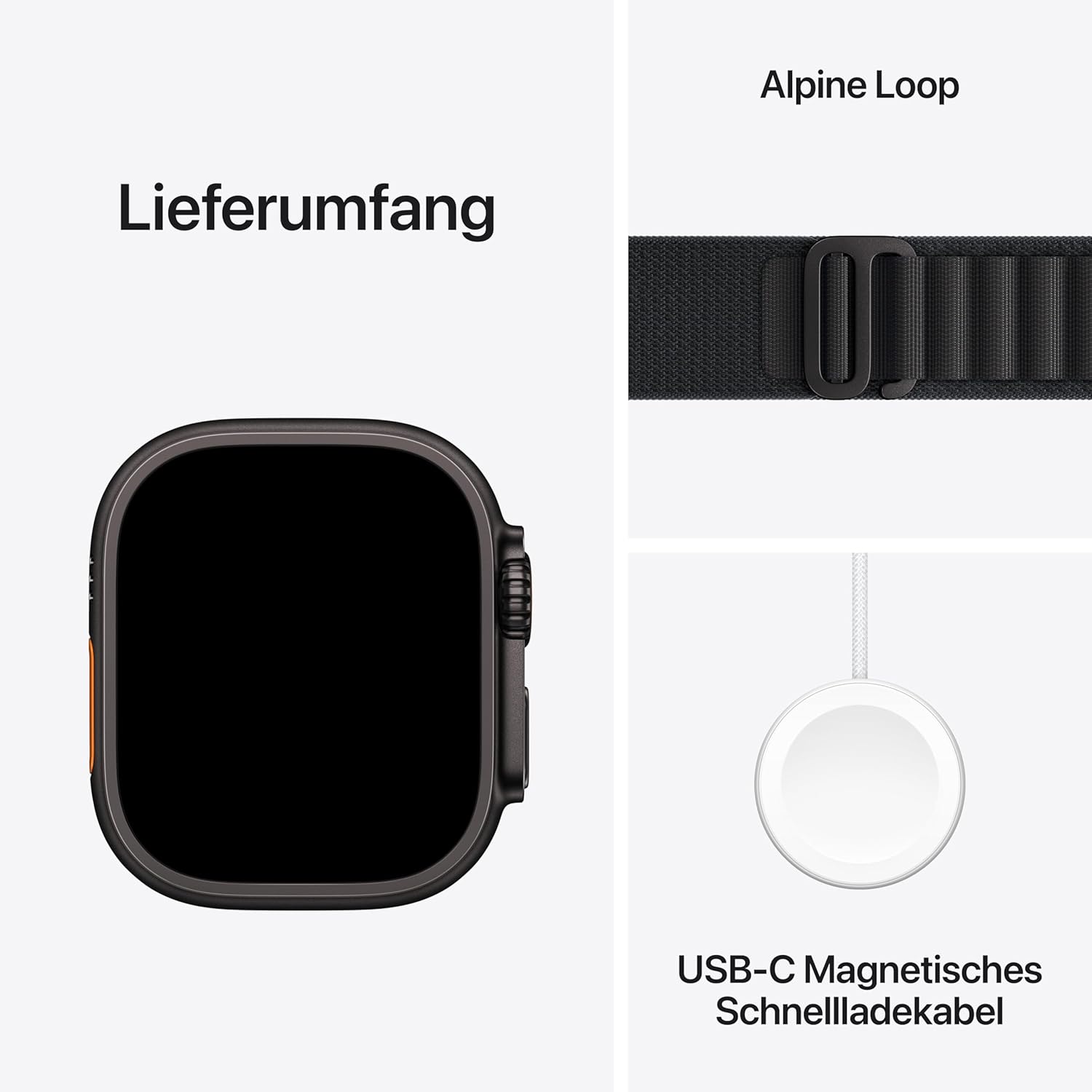 Apple Watch Ultra 3 GPS + Cellular 49 мм Premium Smartwatch за бягане, тренировки и комбинирани спортове със здрав титаниев корпус в черно и алпийска каишка в черно (среден размер)