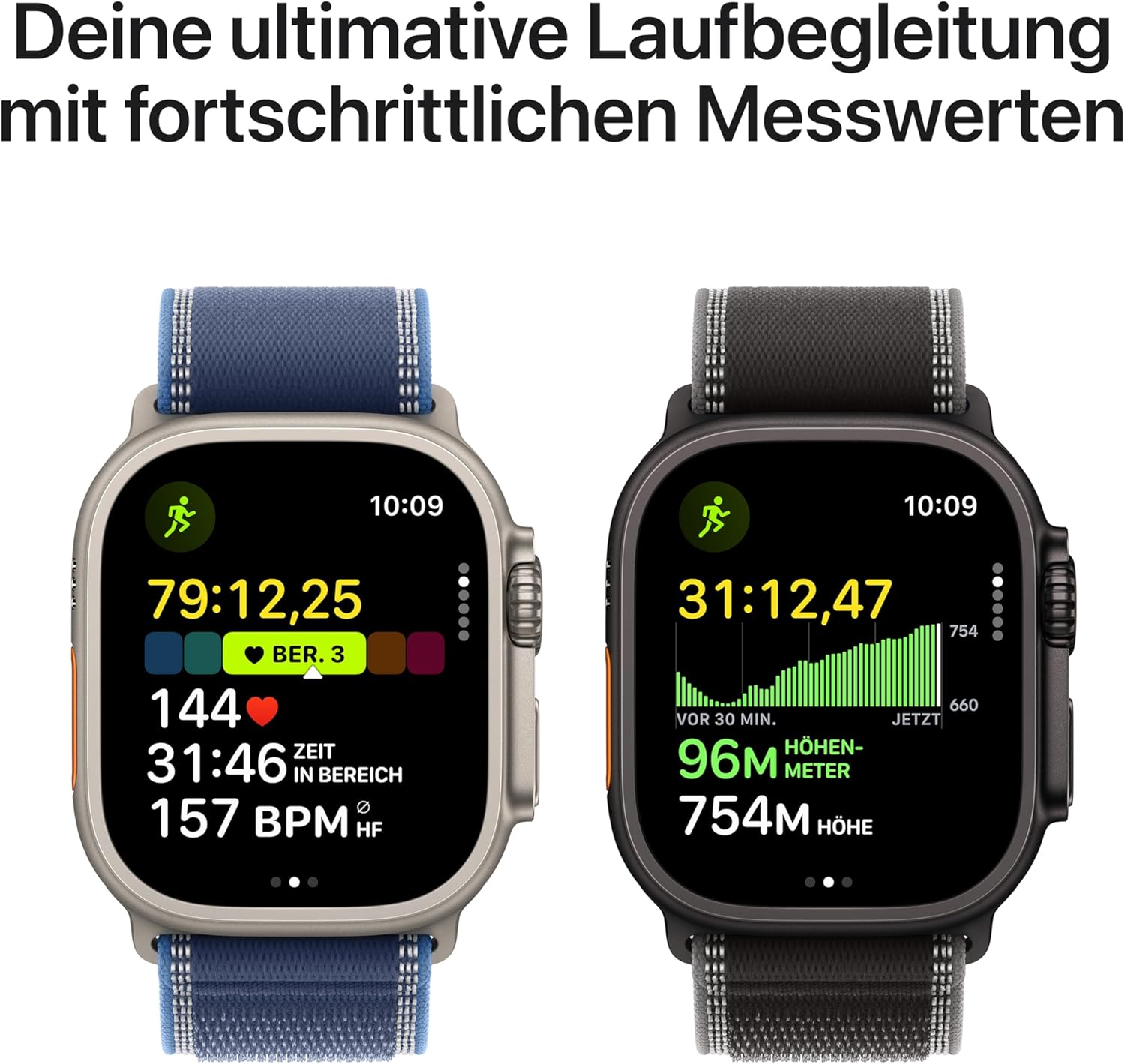 Apple Watch Ultra 3 GPS + Cellular 49 мм първокласен смарт часовник за бягане, тренировки и комбинирани спортове със здрав титаниев корпус в черно и каишка за бягане в черно/въглено сиво (S/M)