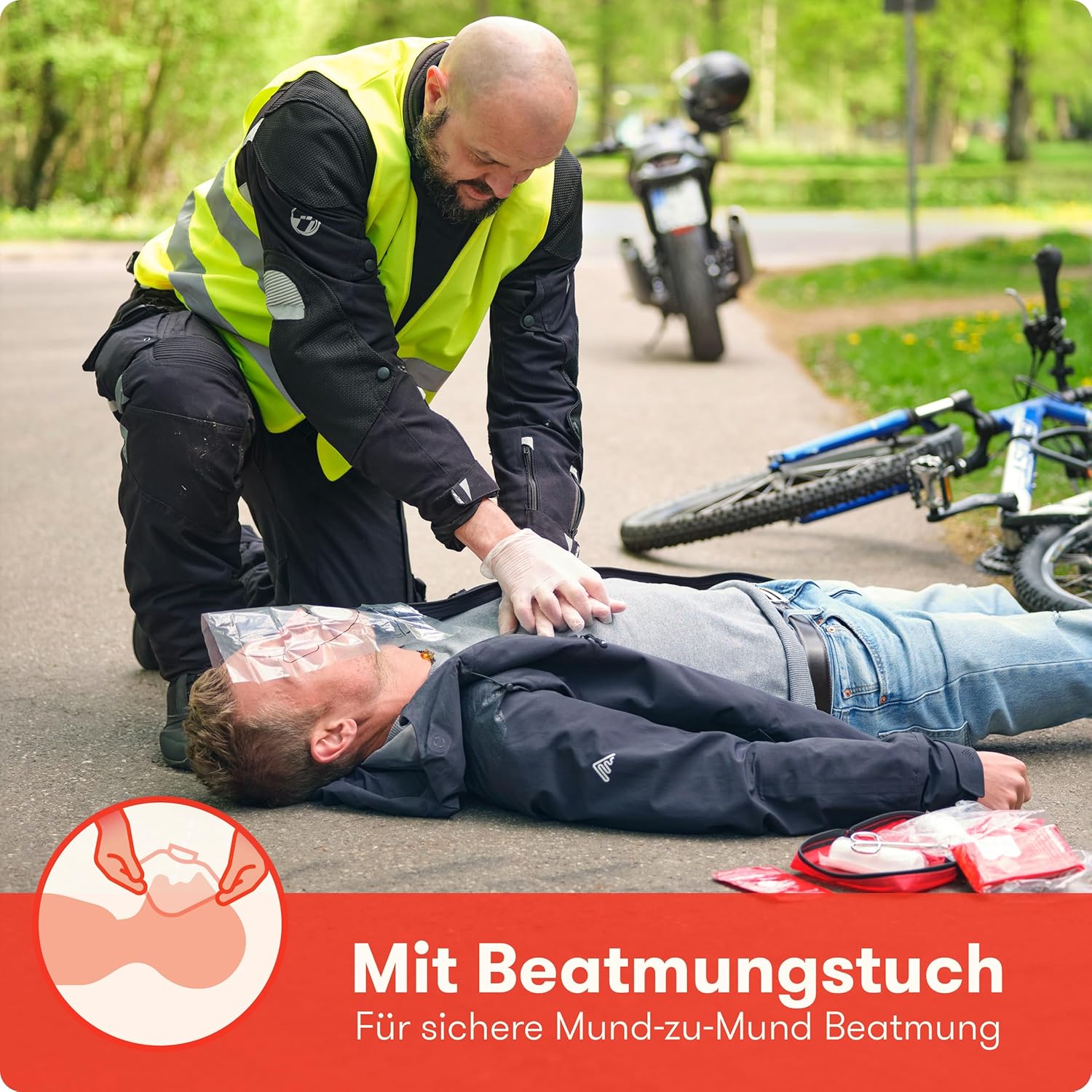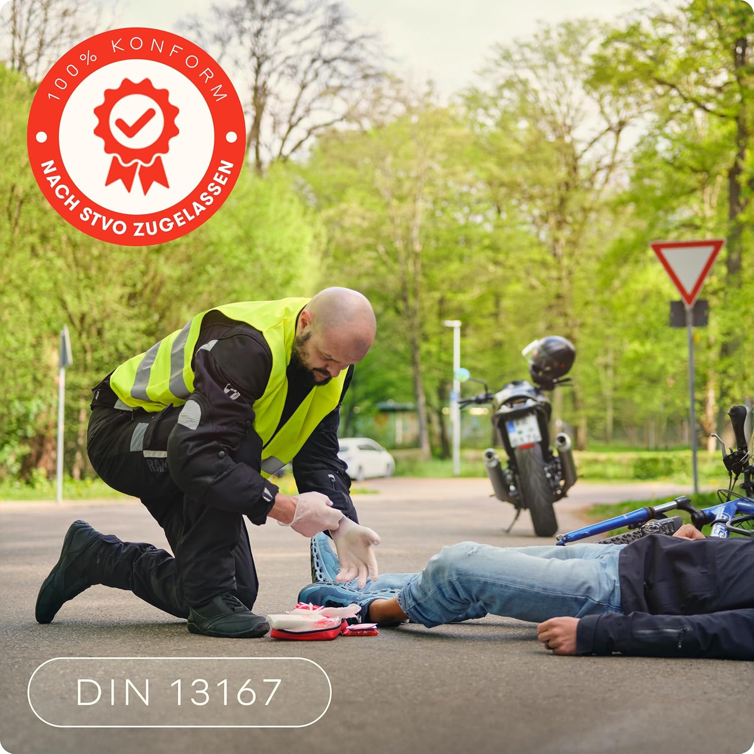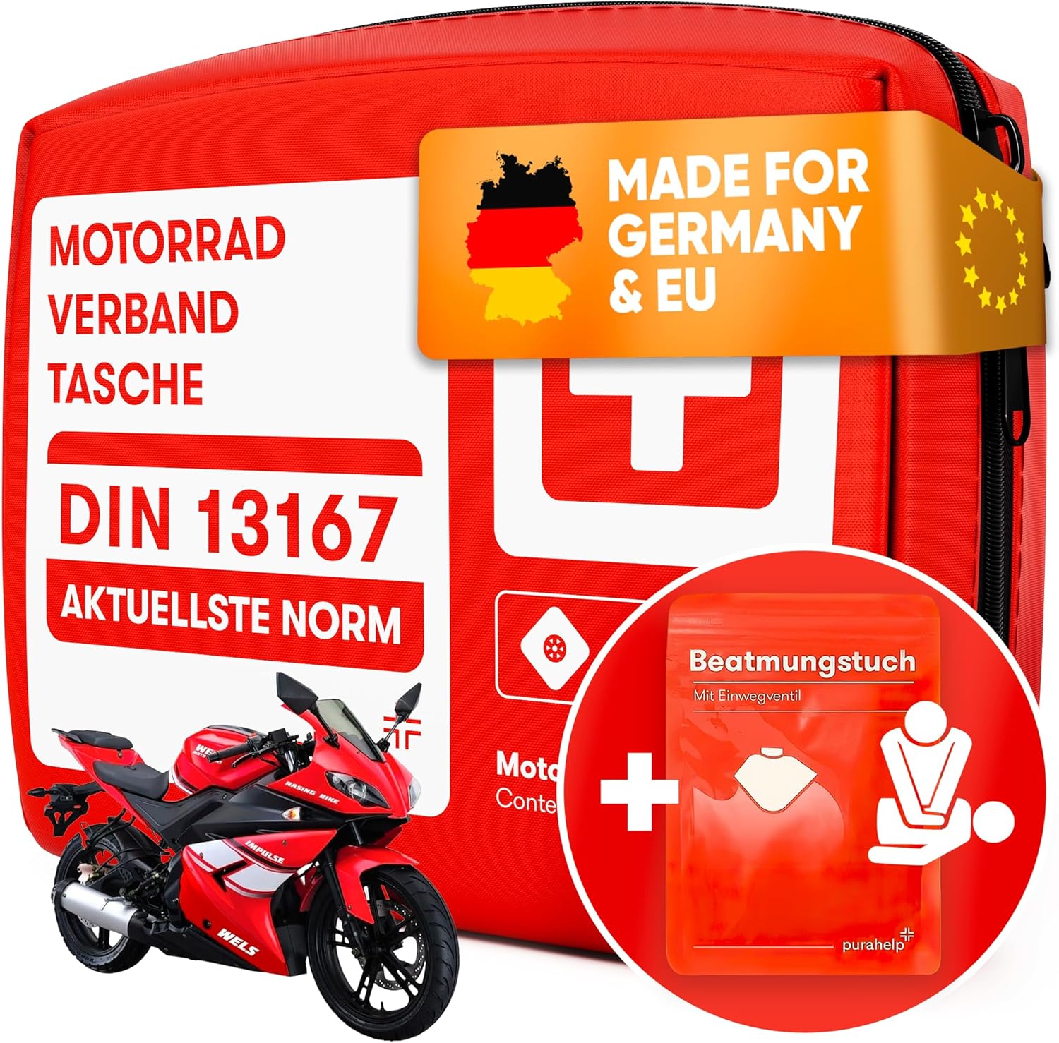 • Отговаря на законовите изисквания - Нашият комплект за първа помощ за мини мотоциклет отговаря на действащия стандарт DIN 13167. Допълнителната маска за CPR е идеално допълнение.