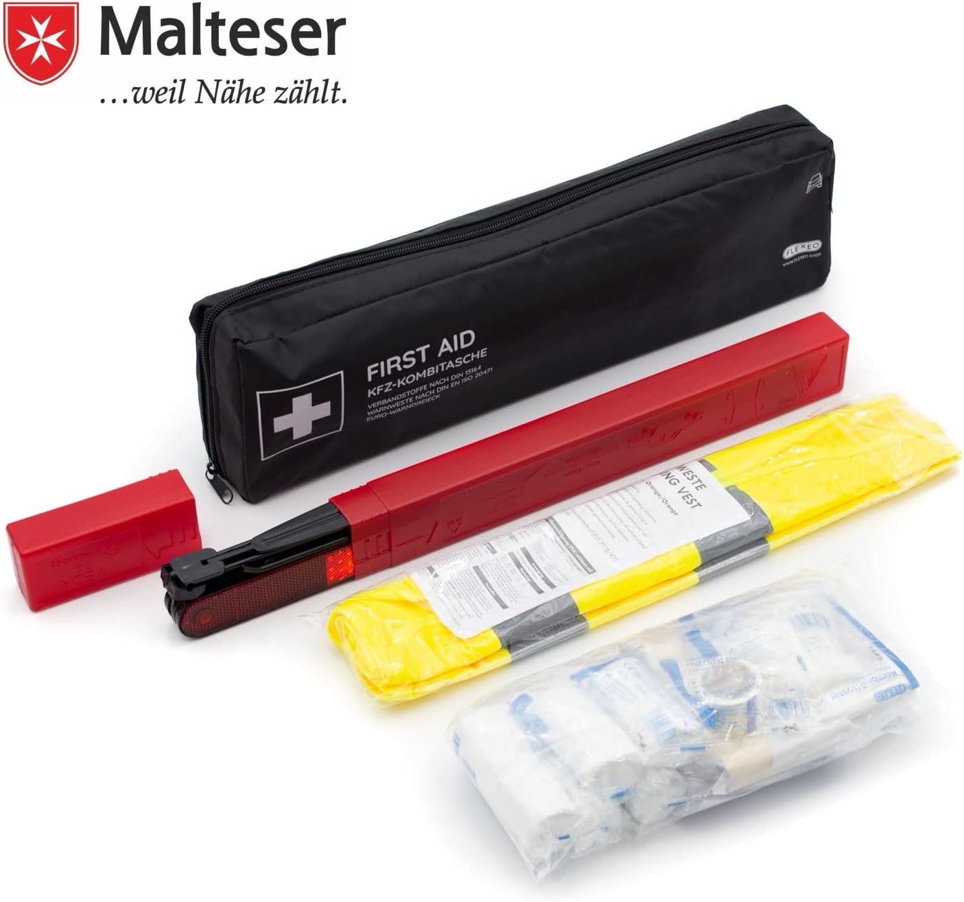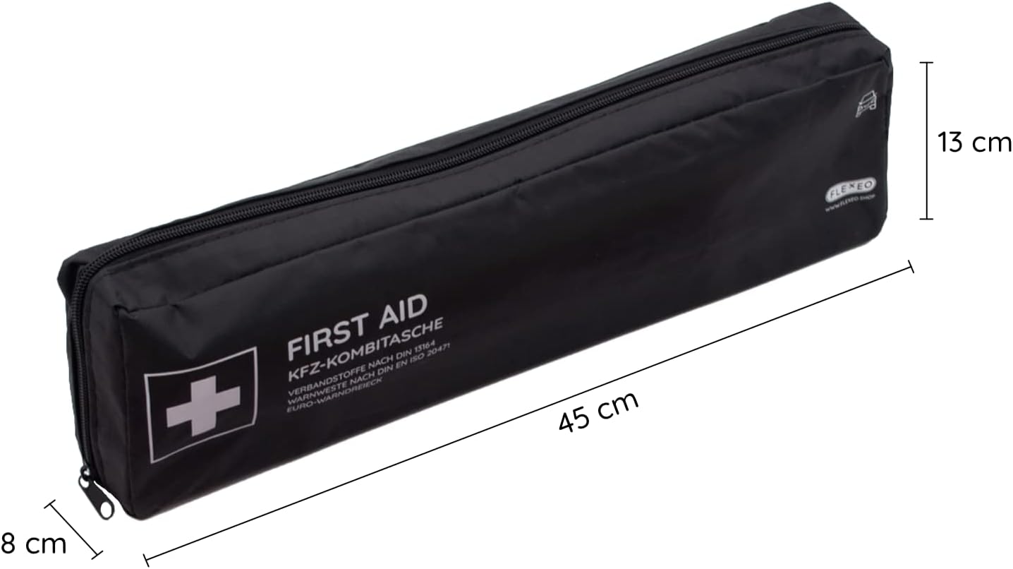 Аптечка за превозно средство, включваща предупредителен триъгълник и светлоотразителна жилетка съгласно действащия DIN 13164:2022 | Валидна до 2025 г. | Аптечка за автомобили/мотоциклети | черна | дълъг формат