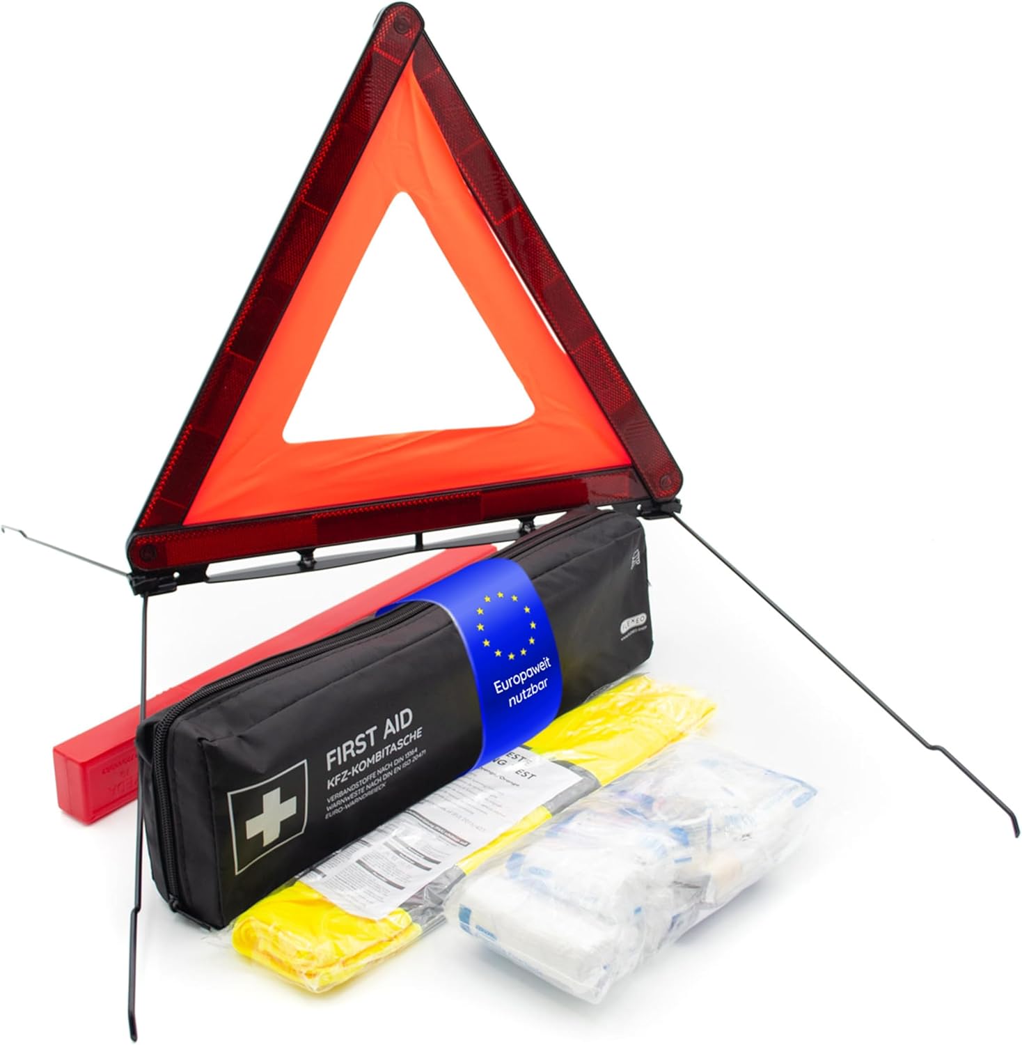 • СЪДЪРЖАНИЕ СПОРЕД DIN 13164:2022: Нашата комплект за първа помощ за превозно средство с предупредителен триъгълник и предупредителна жилетка естествено отговаря на действащия DIN 13164:2022 и следователно отговаря на всички насоки на правилата за движение по пътищата.