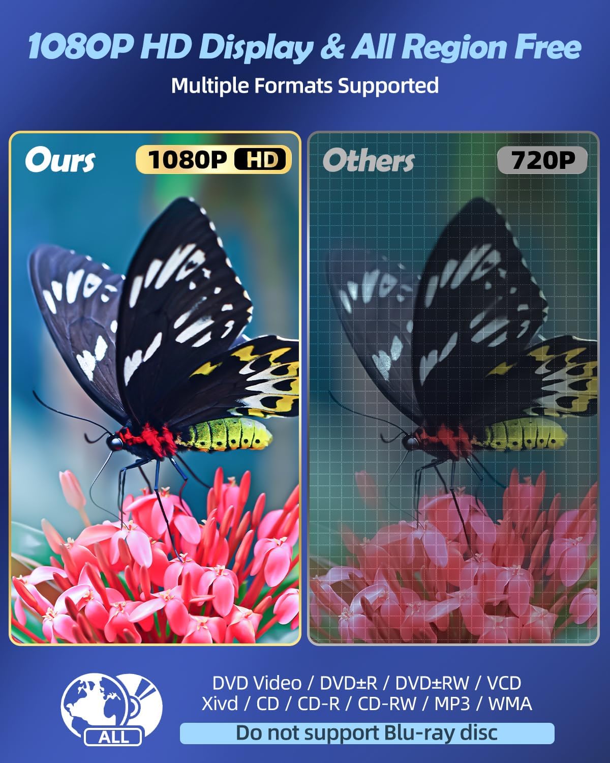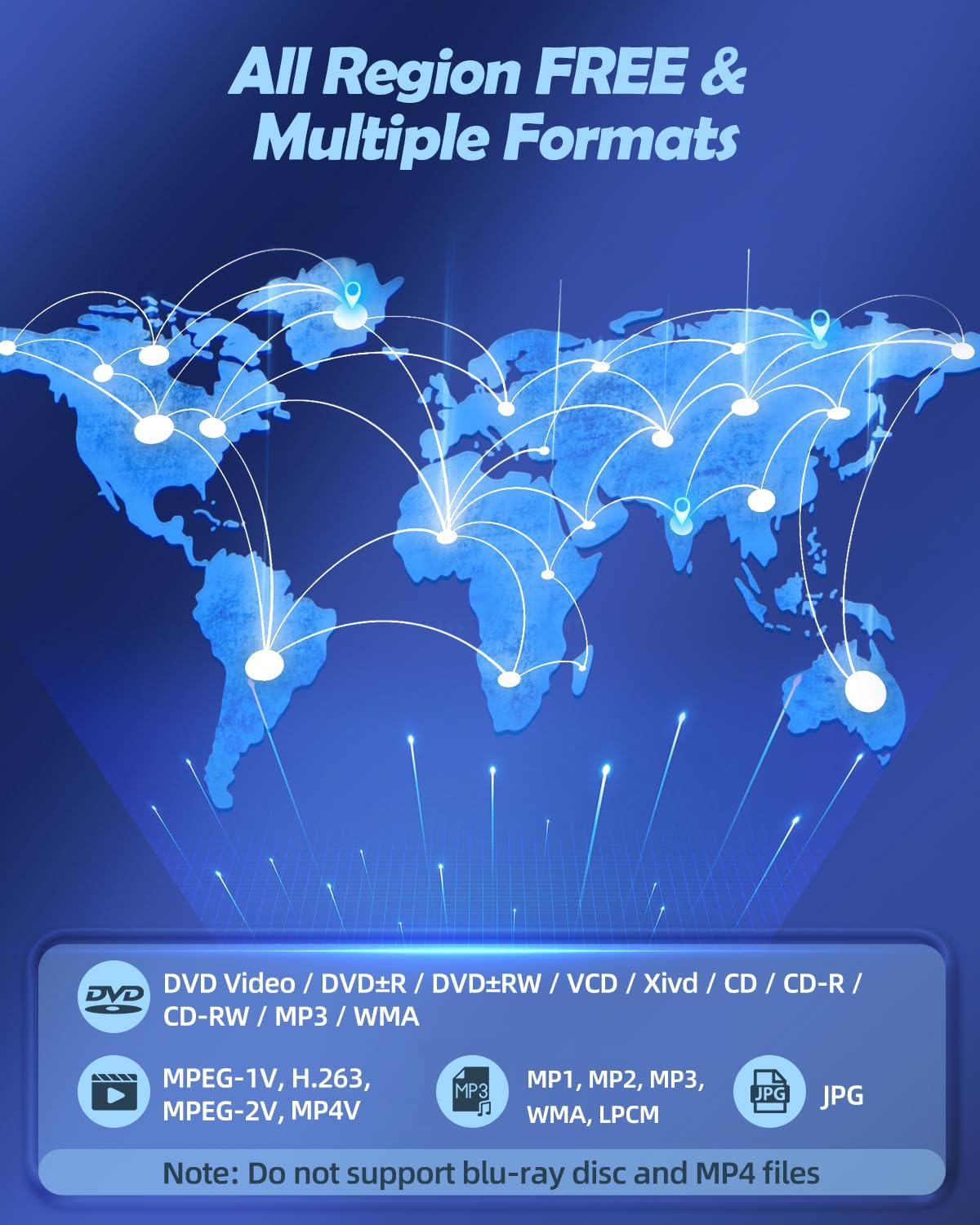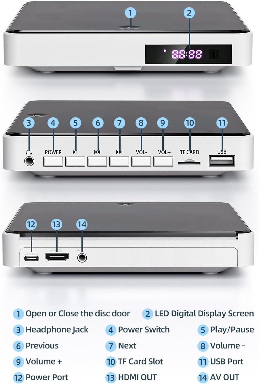 • Без регионални ограничения: нашият HDMI DVD плейър може да възпроизвежда стандартни дискове от всички страни, поддържа CD, DVD, DVD±R, DVD±RW, CD-R/-RW, VCD, XVID, PHOTO CD; USB/TF входът за карта поддържа възпроизвеждане на MPEG-1V, MPEG-2V, H.263, MP3, MP2, WMA, LPCM, JPG (макс. 32GB с FAT32 формат). Забележка: Blu-ray дискове и MP4 файлове не се поддържат.