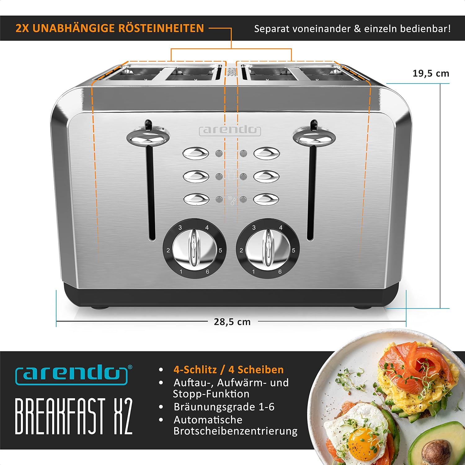 Arendo - Автоматичен тостер за 4 филийки от неръждаема стомана - до четири филийки за сандвичи и препечен хляб - степен на препичане 1-6 - функция за загряване и размразяване - тава за трохи - 1630 вата - сертифициран GS