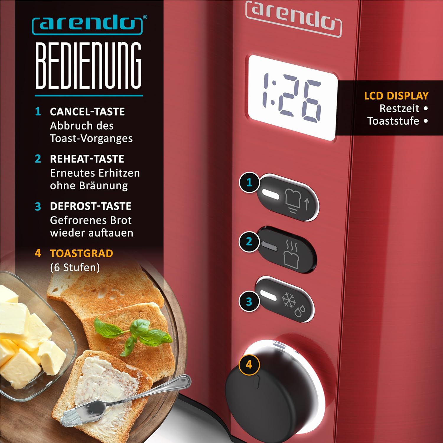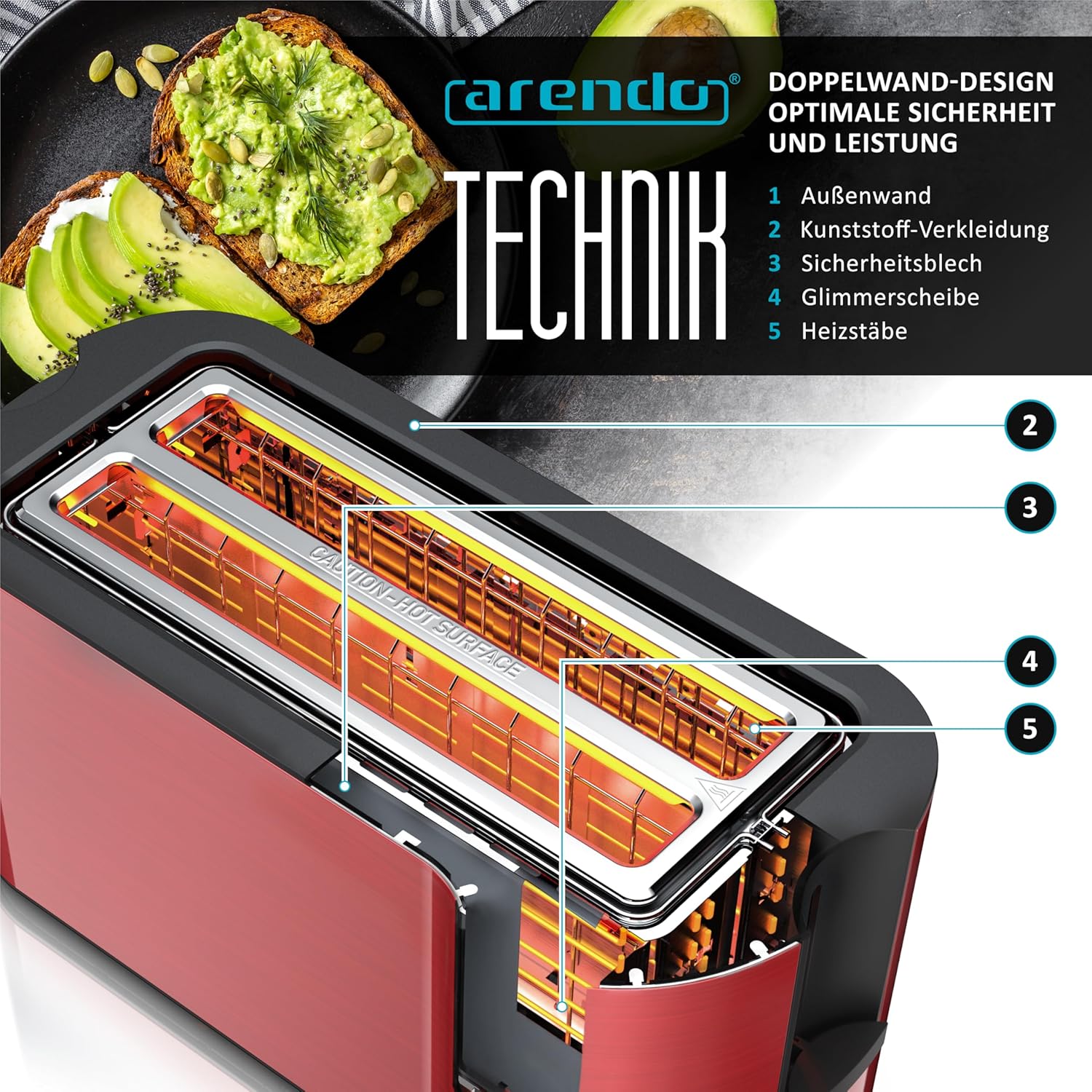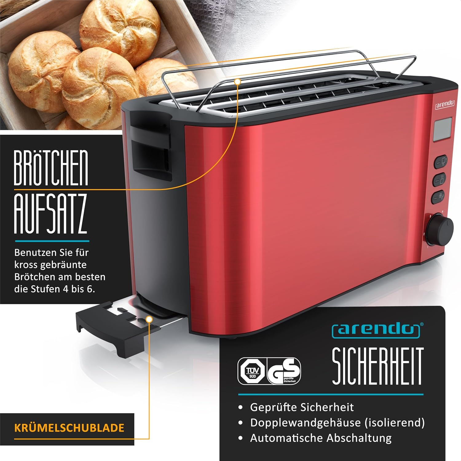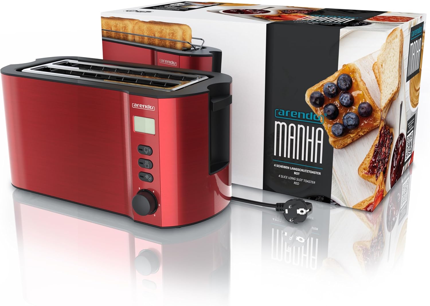 The Arendo MANHA 4-slice stainless steel long slot toaster. With display and integrated bread roll holder for the perfect family breakfast