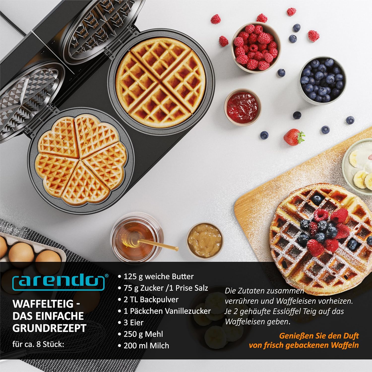 | Lieferumfang | Arendo Waffeleisen, Bedienungsanleitung mit Rezepten |