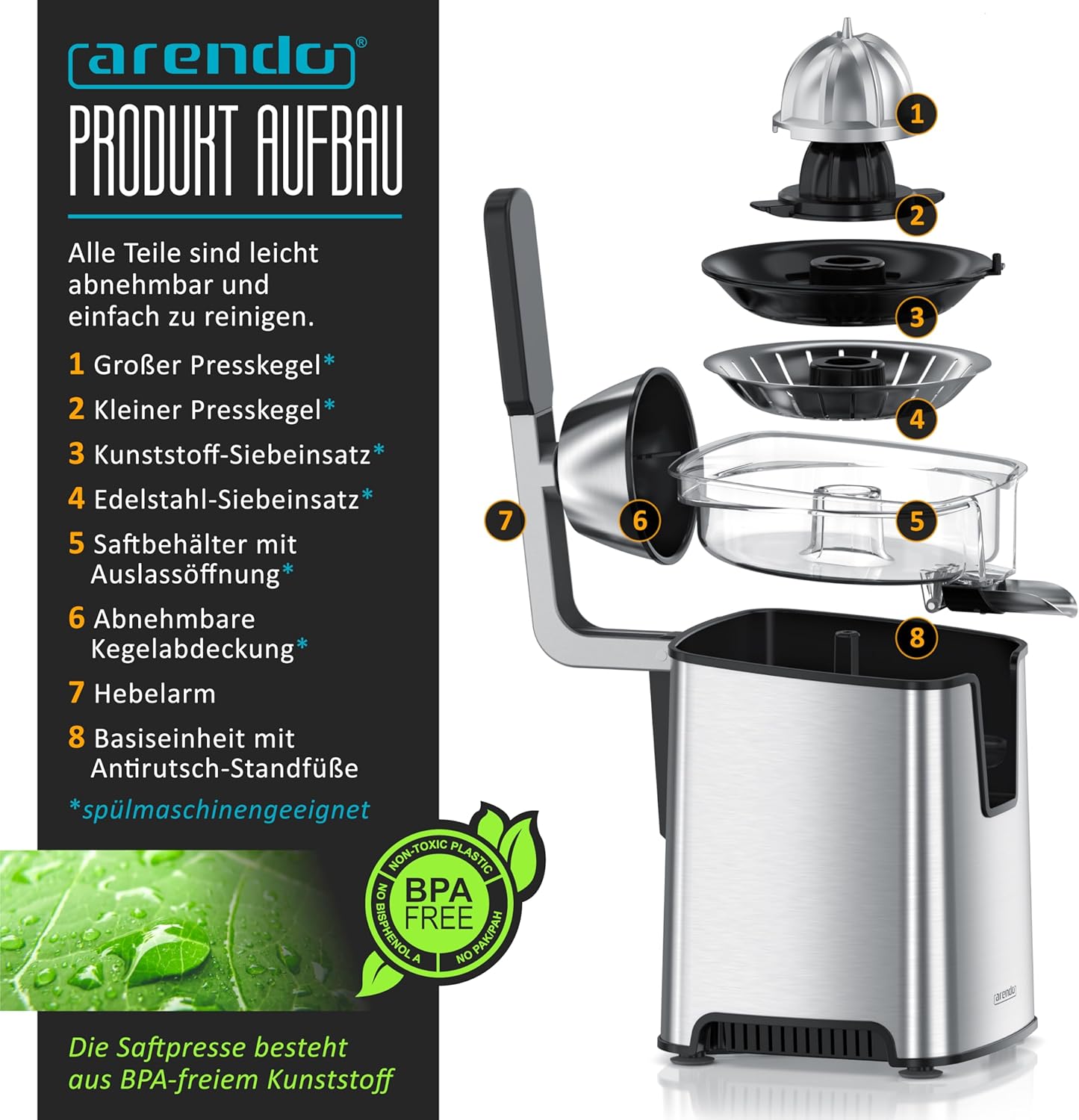 | Reinigung | Saftbehälter, 2x Filter, 2x Presskegel und Kegelabdeckung sind spülmaschinengeeignet |