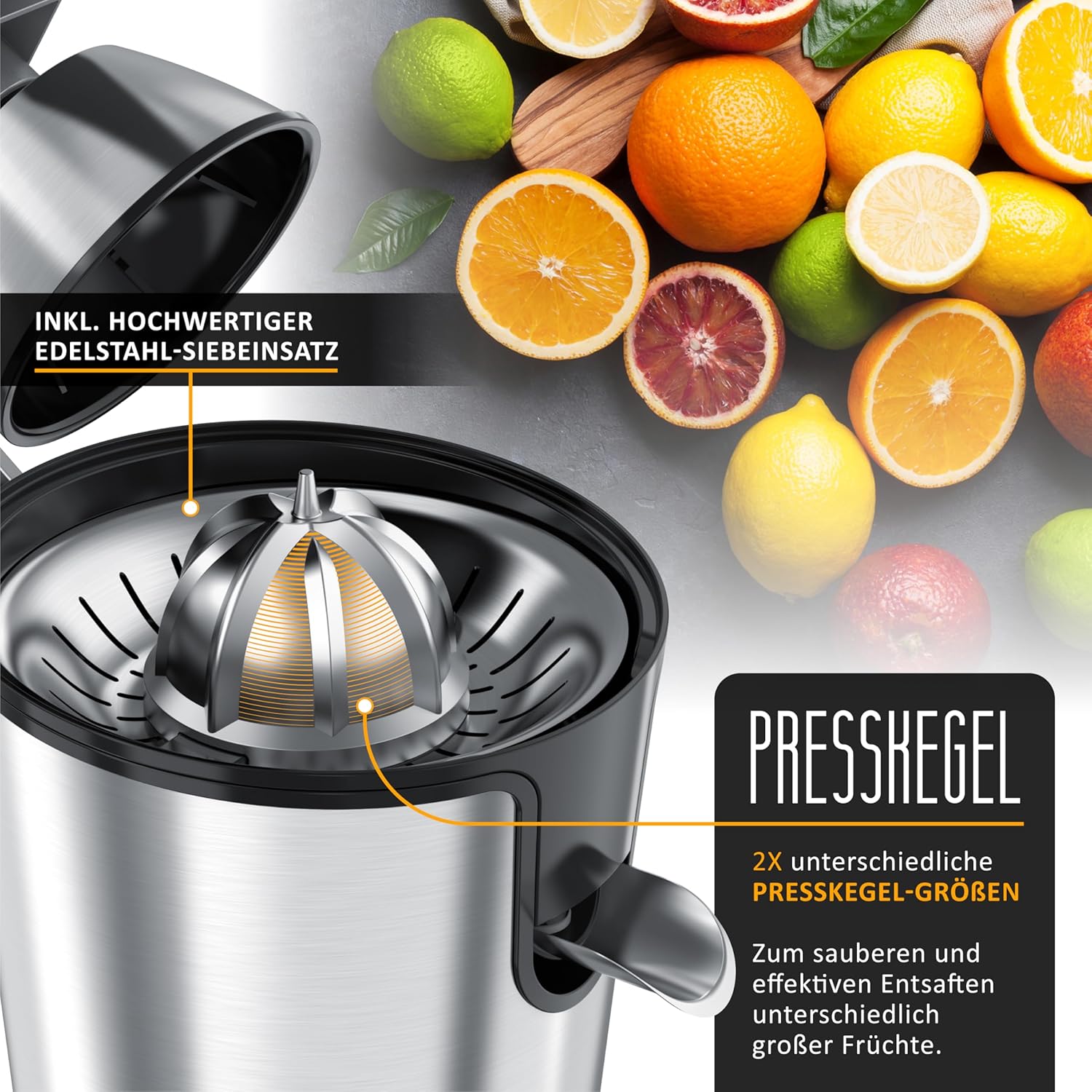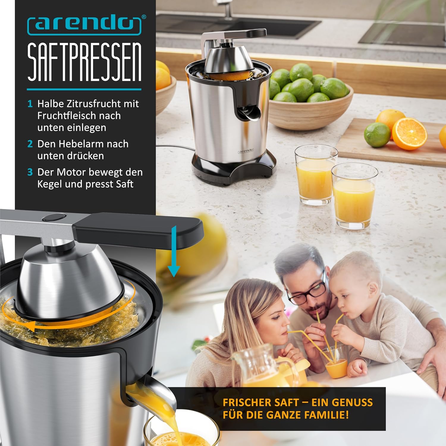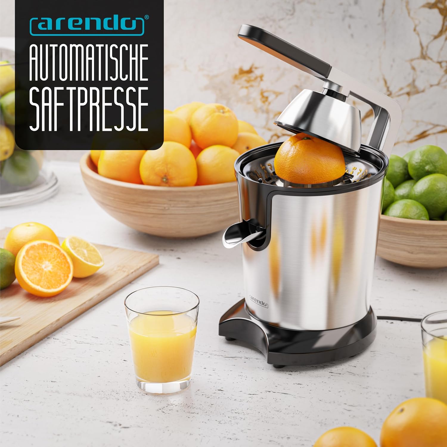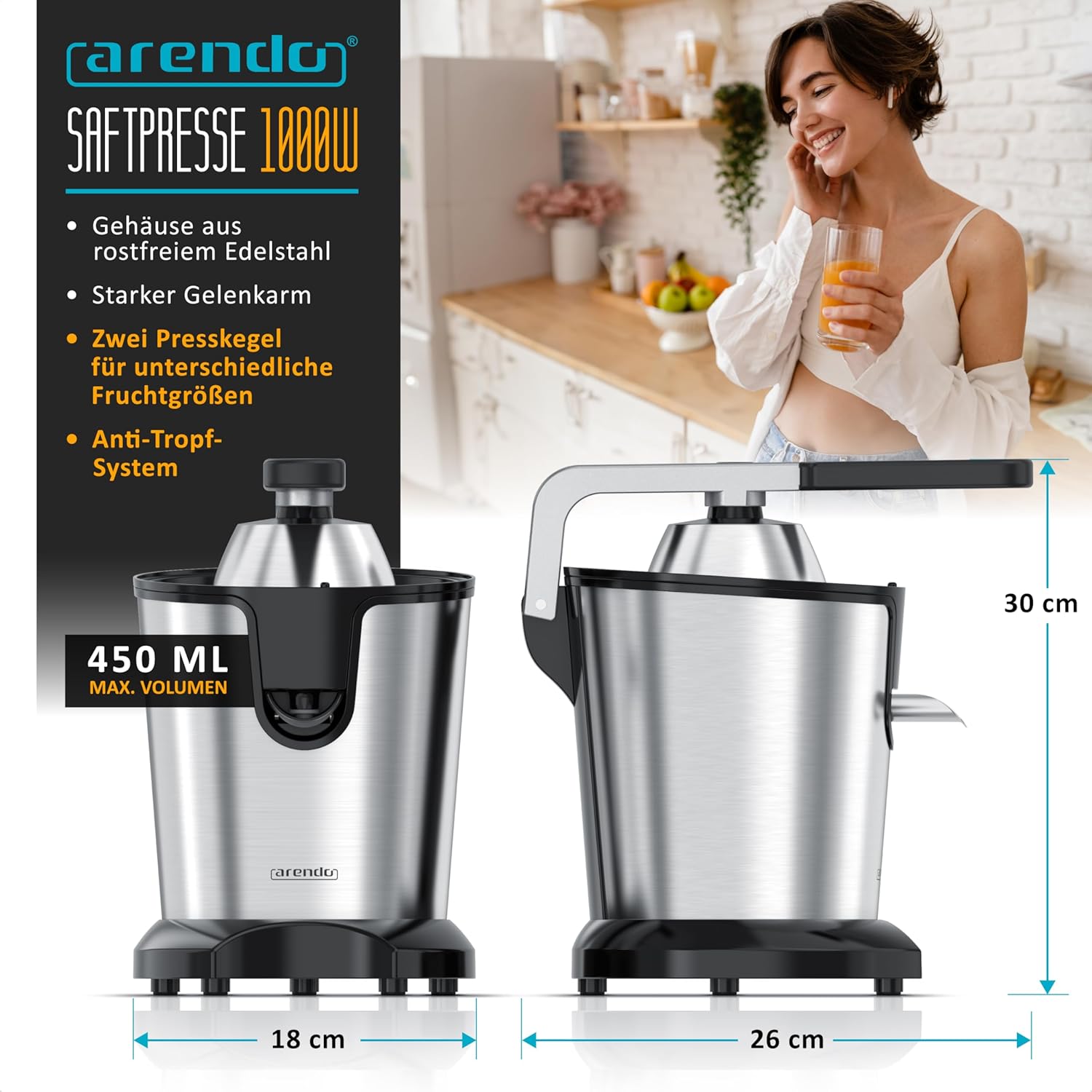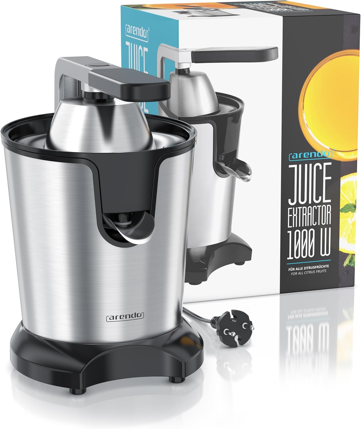 Arendo - Електрическа сокоизстисквачка от неръждаема стомана 1000 вата - Сокоизстисквачка за цитруси и портокали - Високопроизводителен мотор - Много висок добив - Конус от неръждаема стомана - Без BPA - Може да се мие в съдомиялна машина