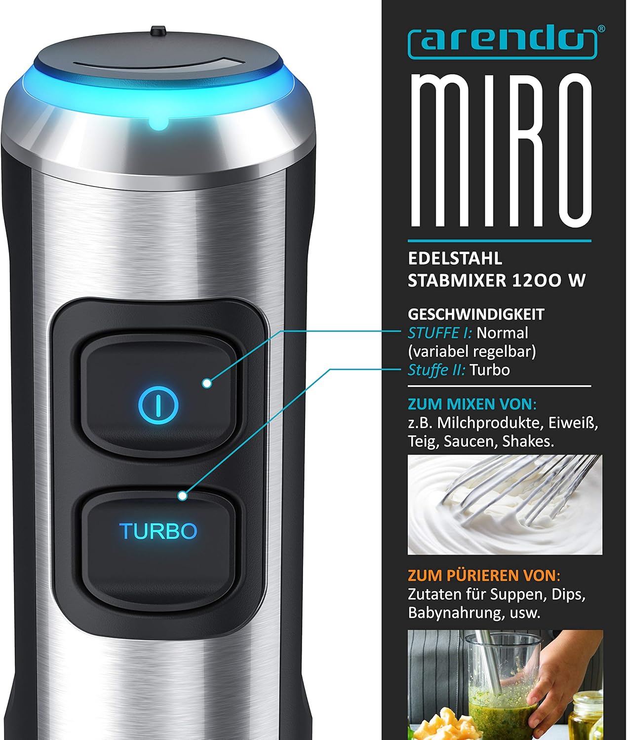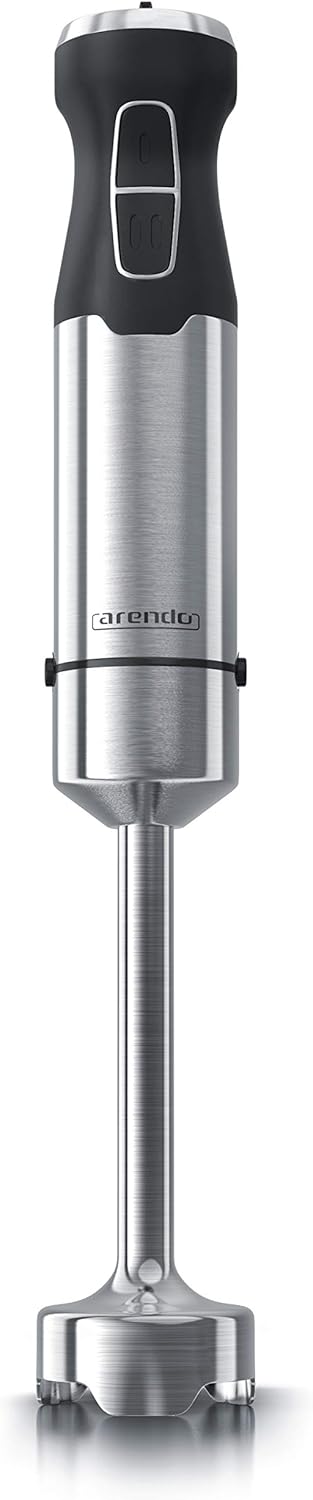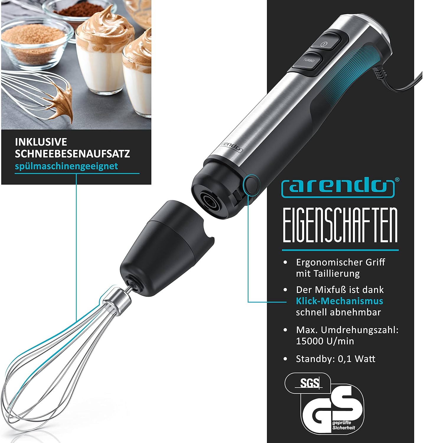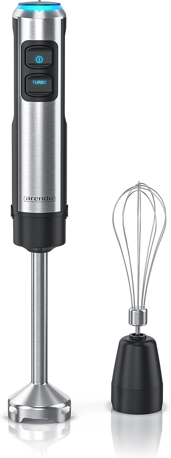 The 1500 watt hand blender from Arendo. Performance you feel. Whether you are pureeing vegetables, chopping nuts or mixing bread spreads, with its 1500 watts, the hand blender in your kitchen is immediately useful. You can adjust the speed sensitively on the controller and switch to maximum power at any time with the turbo button. Do you want to work with the purée stick, whisk or chopper? The choice is yours. Thanks to the quick-change system, the attachments can be replaced in no time.