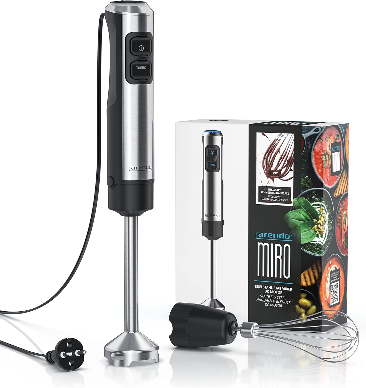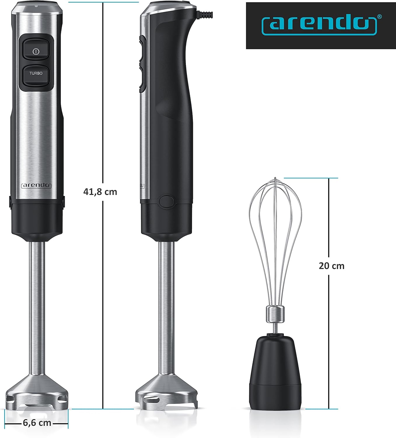 Box contents: Arendo hand blender including Mixing foot + whisk + 500 ml chopper + 800 ml measuring cup + instruction manual (English language not guaranteed)