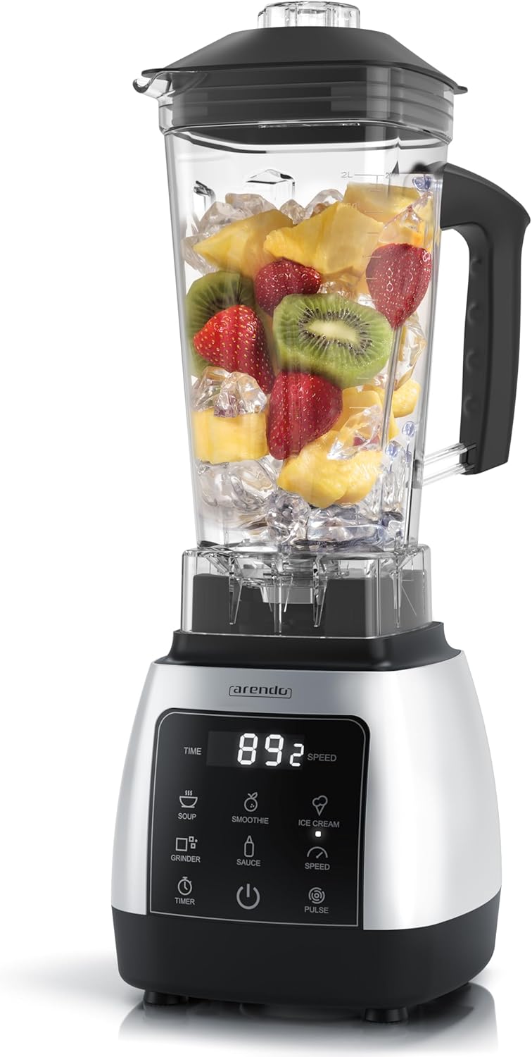High-quality 2000 W blender scaled, 2 litre mixing container (BPA-free), 6-fold cross blades, double ball bearings, 9 touch buttons for comfortable operation, 9 speed settings, up to 24,000 rpm, 5 program modes: Soups, smoothies, ice cream, sauces, grinderWhite display with display of the mixing time and speed level (1-9) pulse function for maximum speed. Timer (countdown timer in 10 seconds steps; max. 90 seconds. Lid with opening for subsequent filling. Safety lock. Stopper