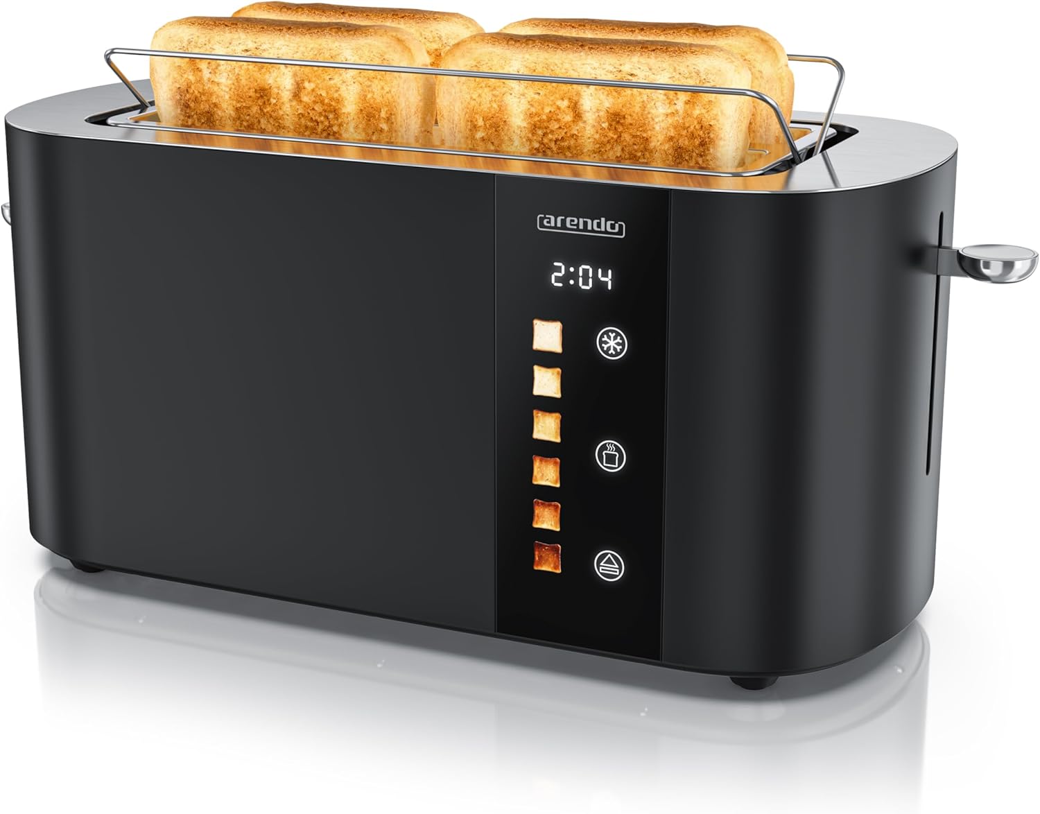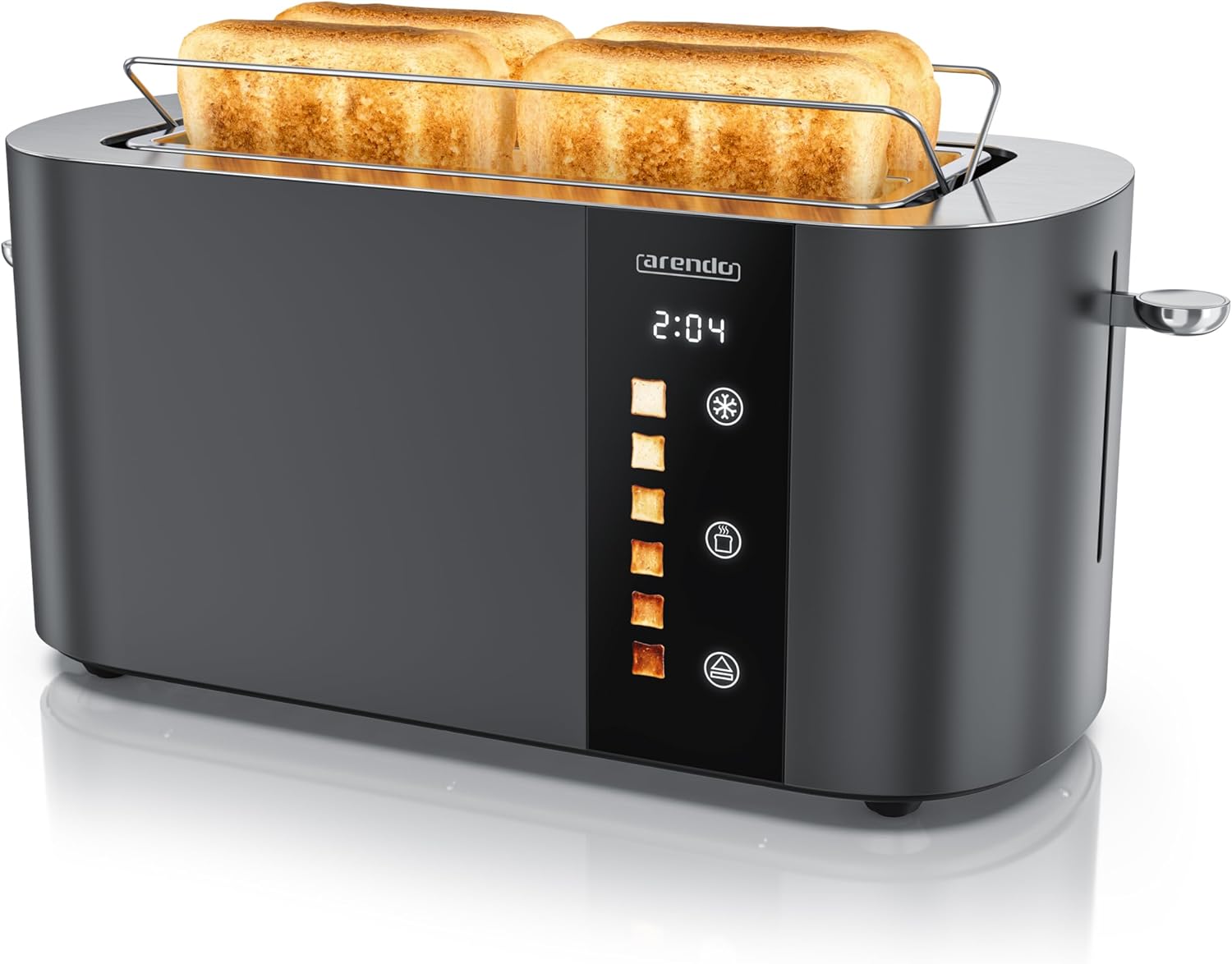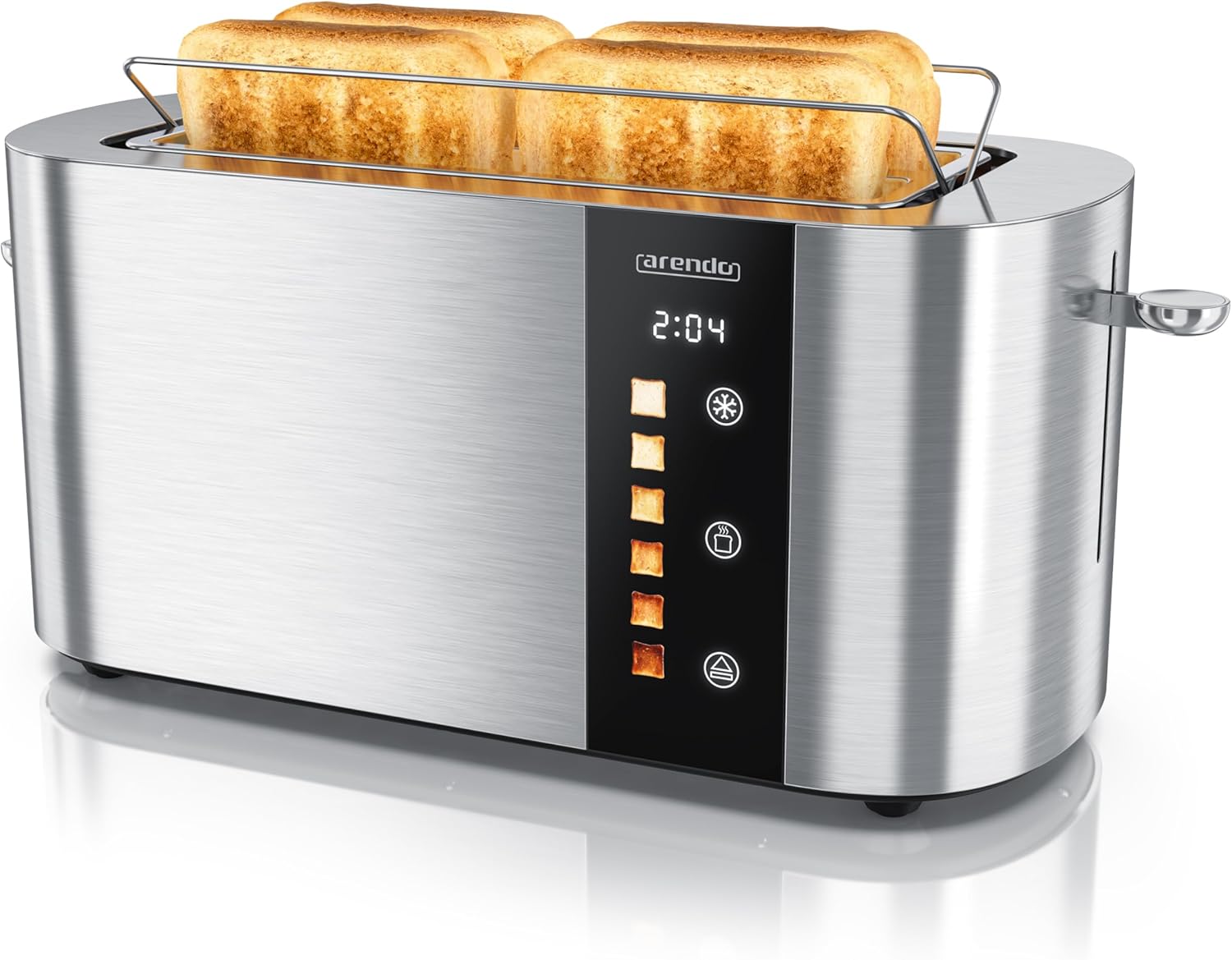 Arendo - Тостер от неръждаема стомана с 4 филии, дълъг отвор - сензорен екран - корпус с двойни стени - 1500 W - вградена приставка за хлебчета - 6 нива на изпичане - центриране на хляба - дисплей за оставащо време - памет