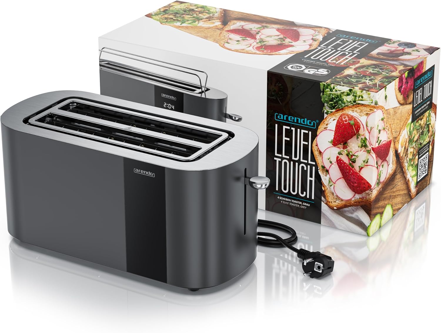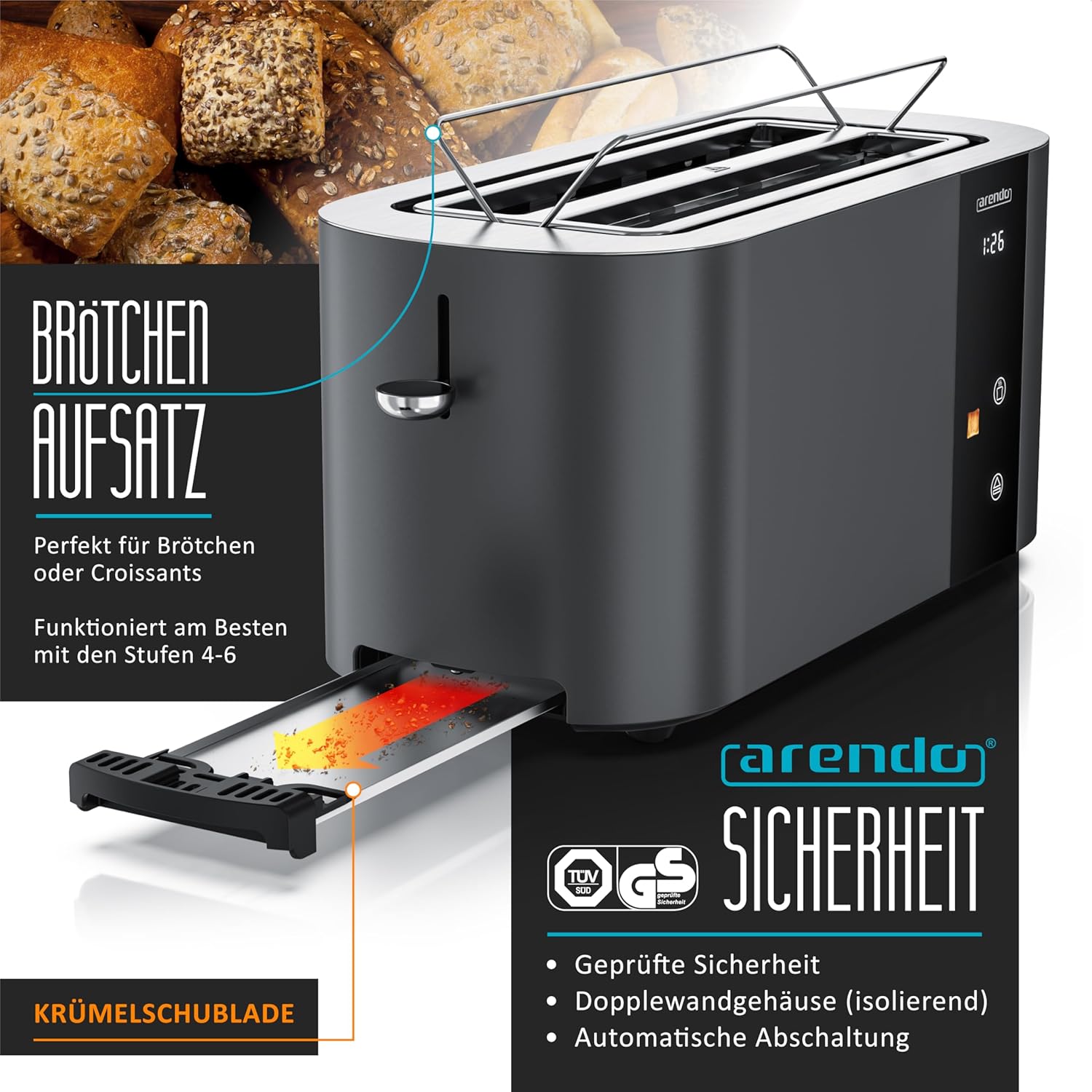 Arendo - Тостер от неръждаема стомана с 4 филии, дълъг отвор - сензорен екран - корпус с двойни стени - 1500 W - вградена приставка за хлебчета - 6 нива на изпичане - центриране на хляба - дисплей за оставащо време - памет