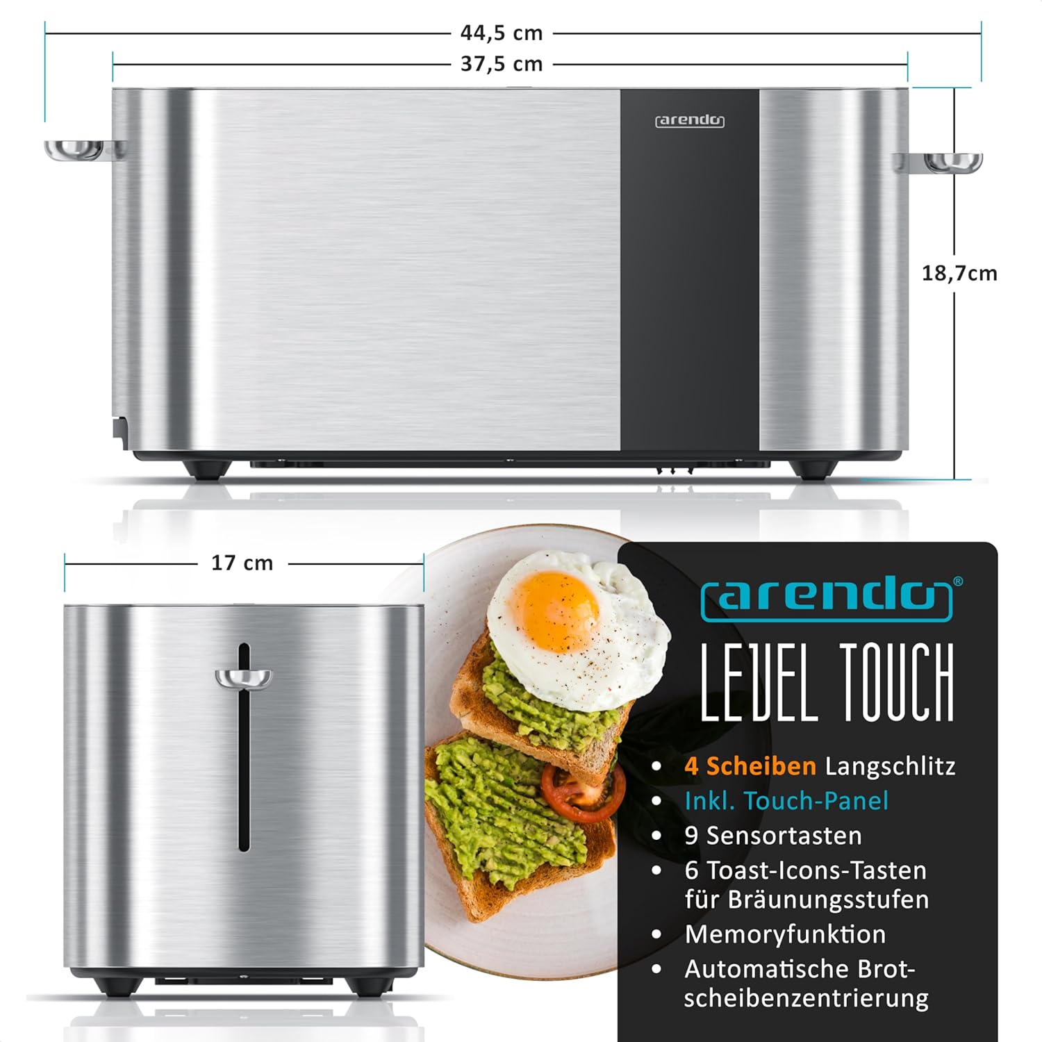 • Технически данни: Размери (без приставката за хлебче): (В x Д x Ш) 18,7 x 44,5 x 17 см | Дължина на кабела: 87 см | Тегло: приблизително 1900 г. Материал: много неръждаема стомана, малко пластмаса. Съдържание на кутията: Тостер Arendo Level Touch с 4 филийки и двоен дълъг отвор, цветен дисплей + ръководство за употреба (английски език не е гарантиран)