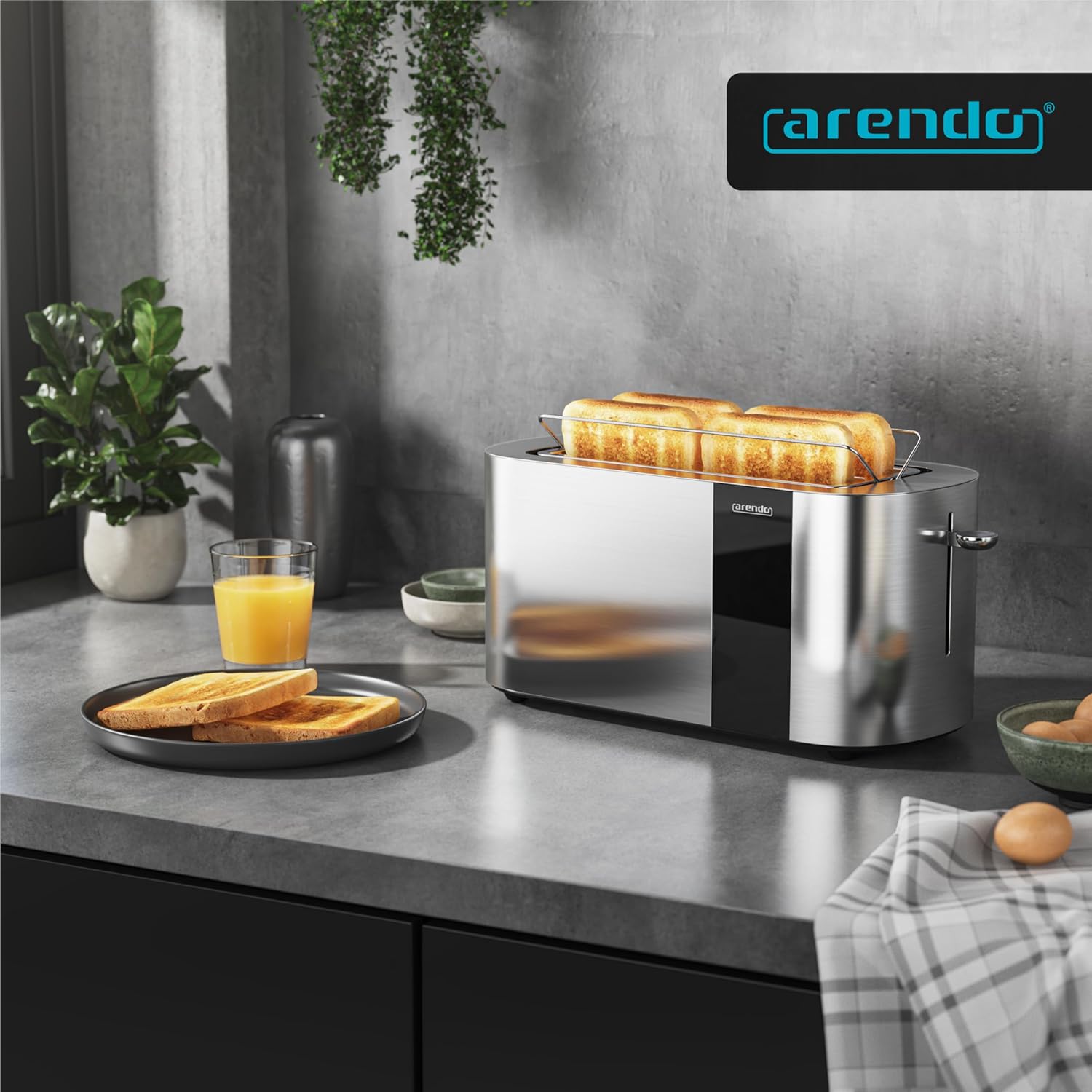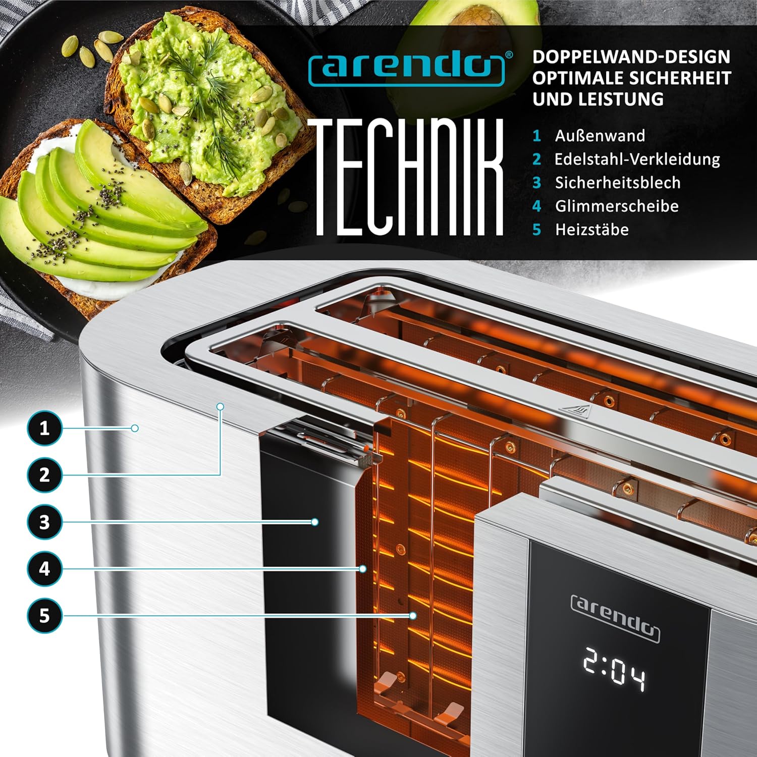 • ИНОВАЦИЯТА ОТ СПЕЦИАЛИСТА ПО ТОСТЕРИ ARENDO. Предефиниран комфорт при препичане: 6-те икони за препичане с дисплей за степени на препичане позволяват прецизен предварителен избор от леко препечено до изключително хрупкаво. Практичният LED дисплей с таймер за обратно броене ви позволява да видите кога вашият препечен хляб е готов за печене. Тостерът с двоен дълъг отвор с мощност 1500 W ви осигурява 4 филийки препечен хляб на процес на препичане - идеален за цялото семейство. GS - тествана безопасност | 307189