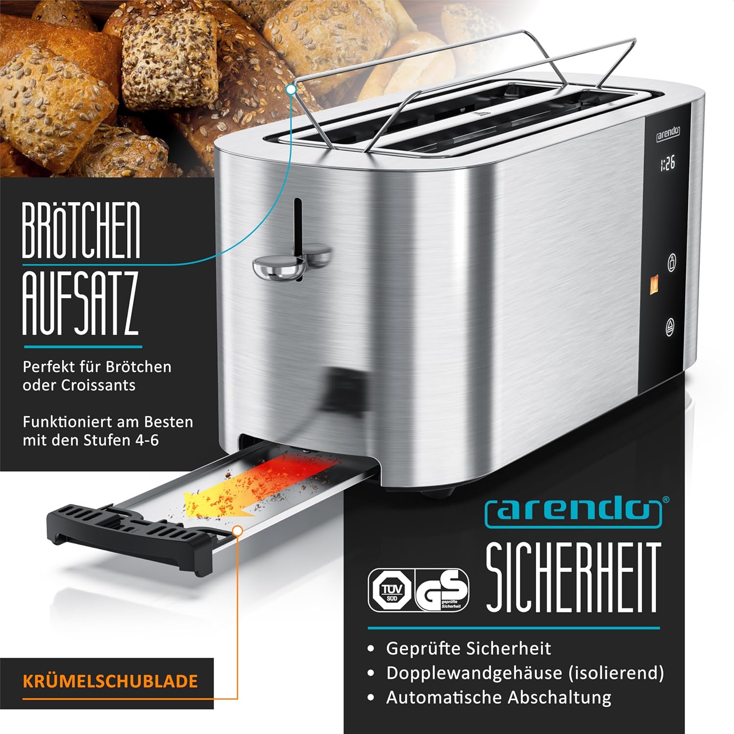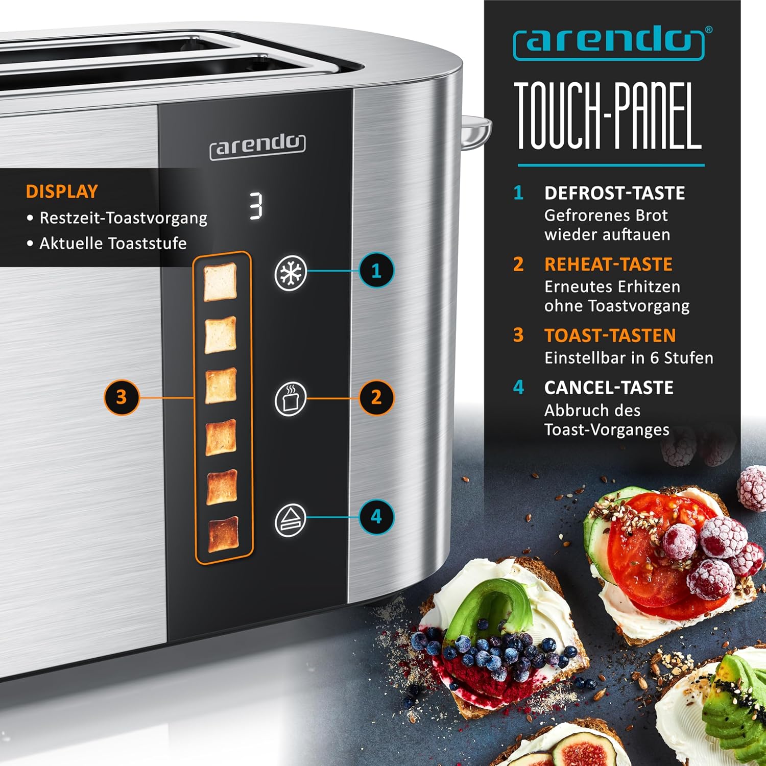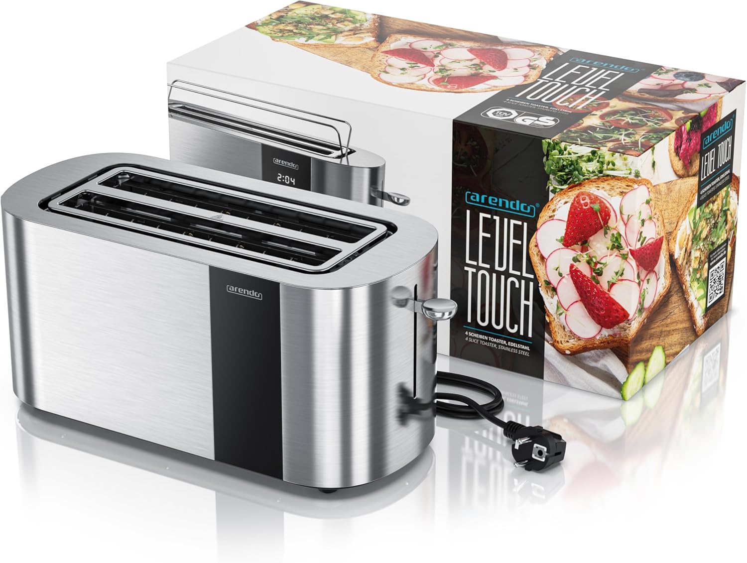 Arendo - Тостер от неръждаема стомана с 4 филии, дълъг отвор - сензорен екран - корпус с двойни стени - 1500 W - вградена приставка за хлебчета - 6 нива на изпичане - центриране на хляба - дисплей за оставащо време - памет