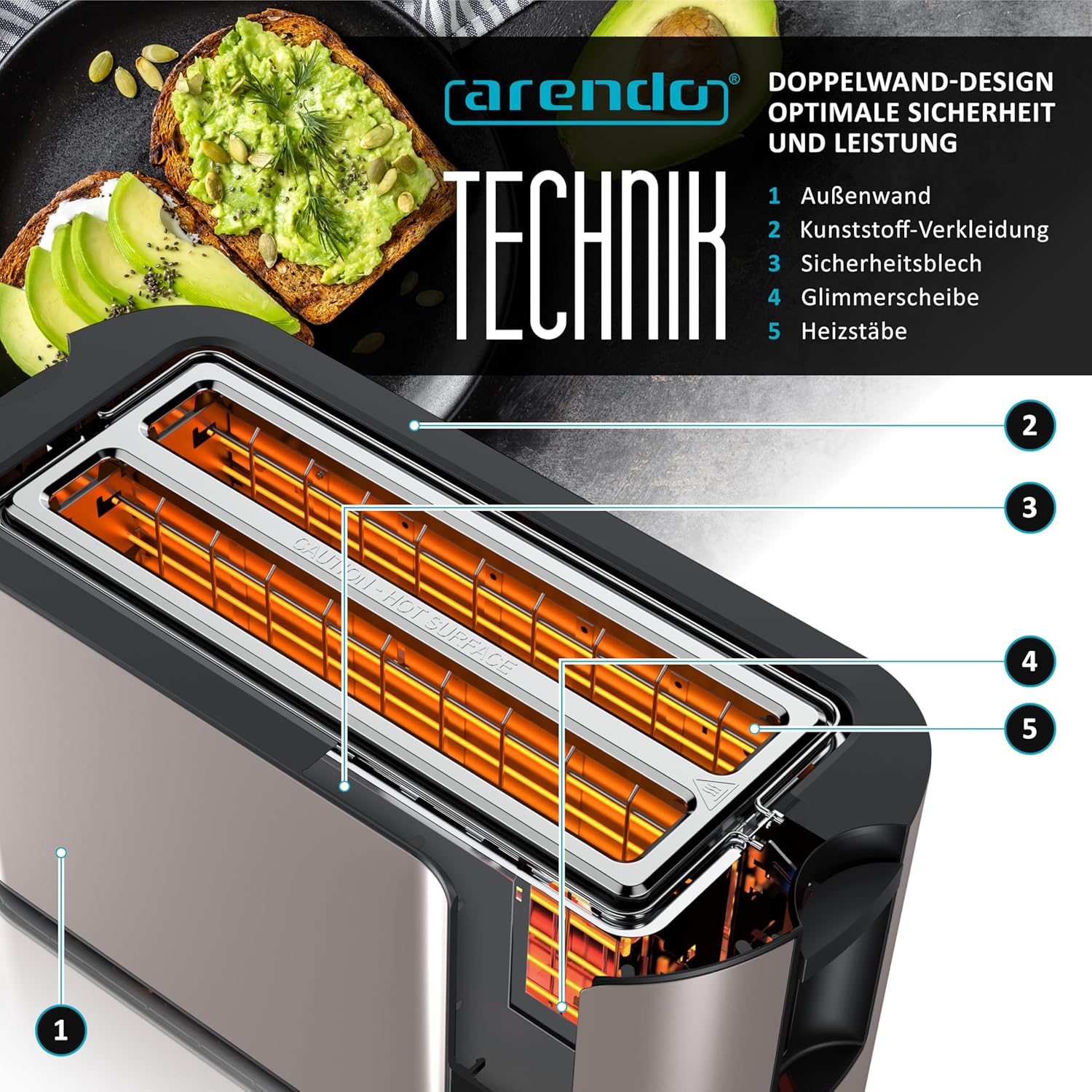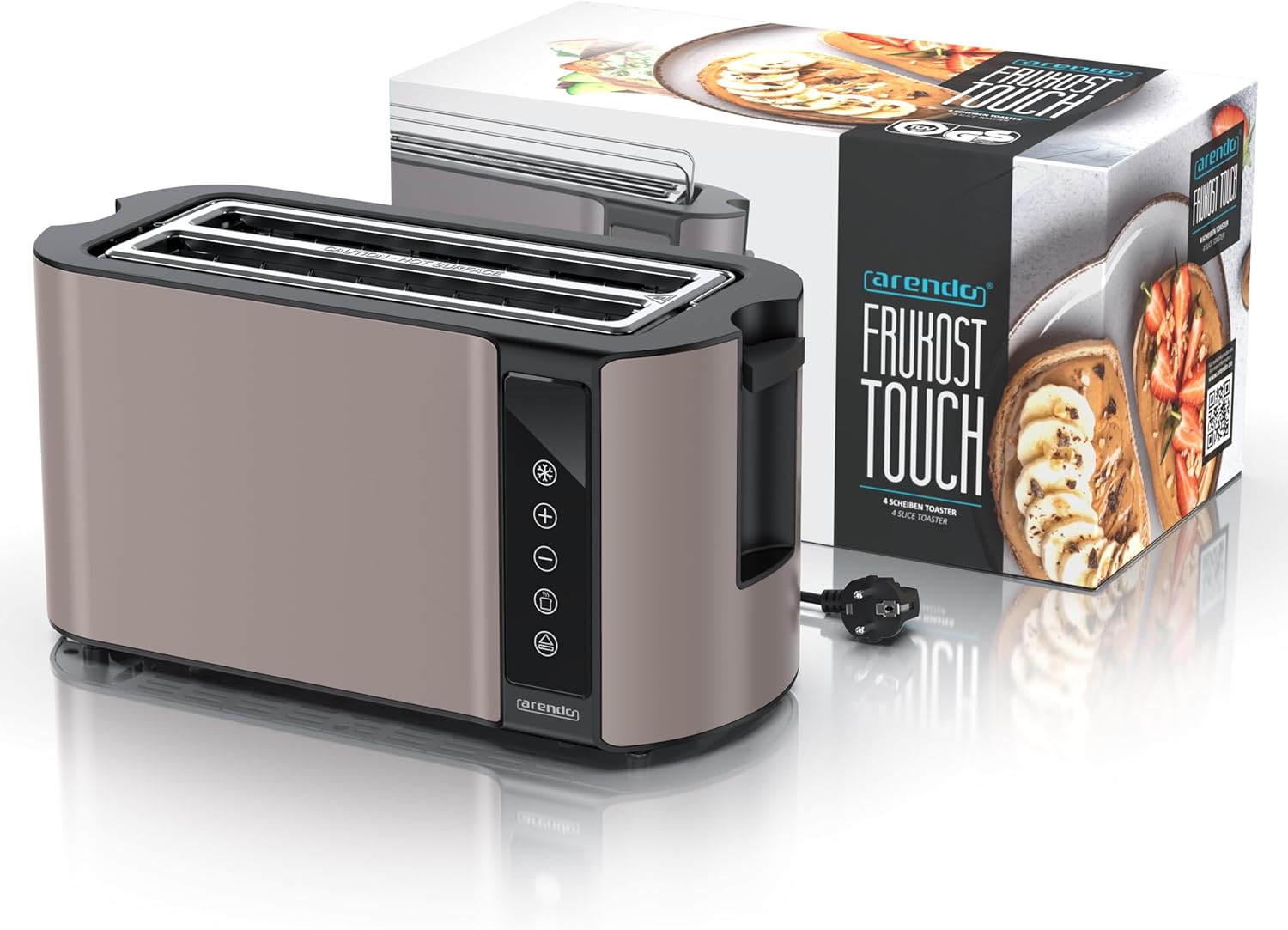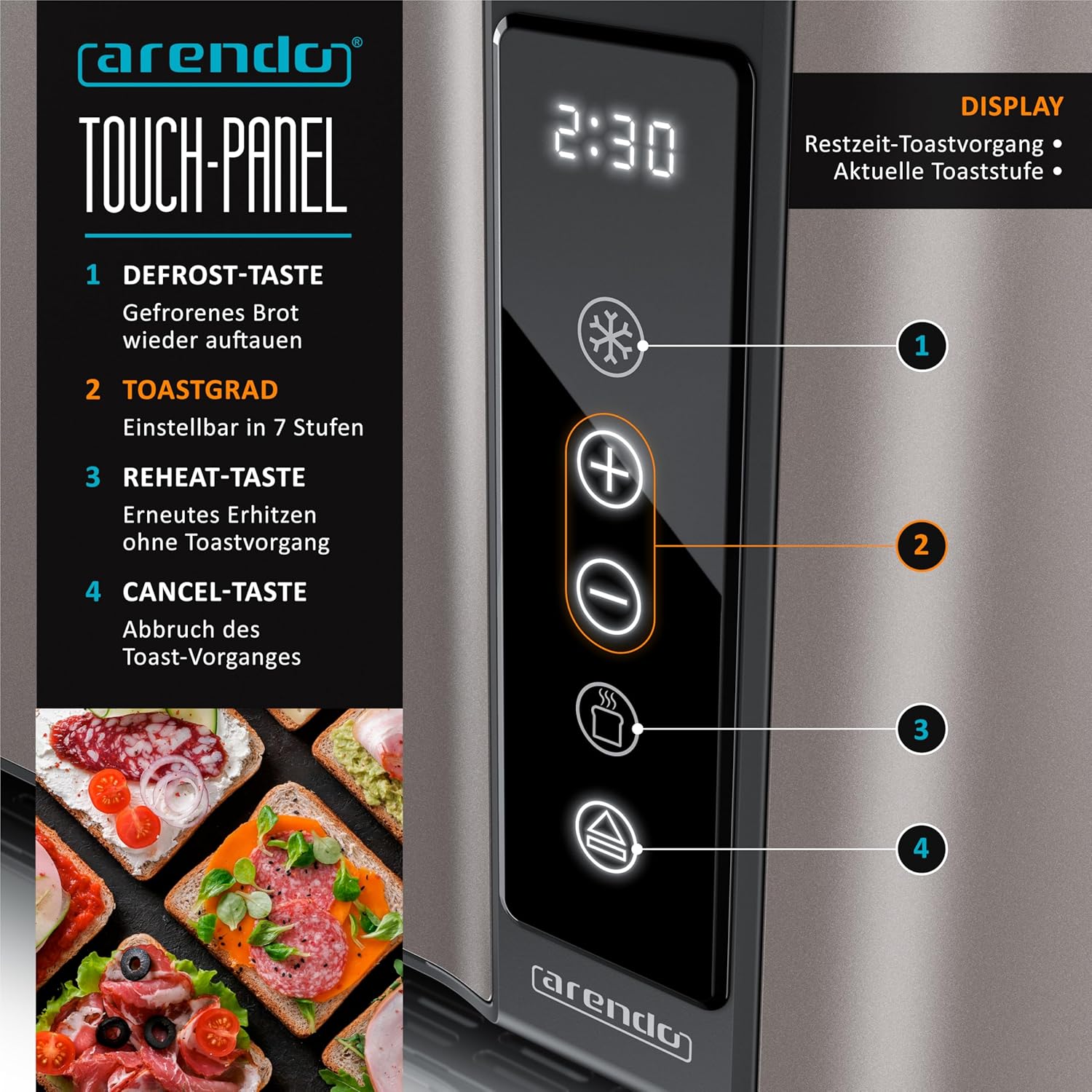 Arendo - Тостер от неръждаема стомана с дълъг отвор, 4 филии, сензорен екран - Двойностенен корпус - 1500 W - Вградена приставка за хлебчета - 7 нива на изпичане - Центриране на хляба - Дисплей за оставащо време - Памет