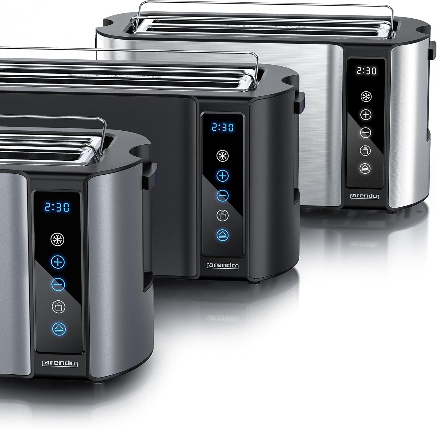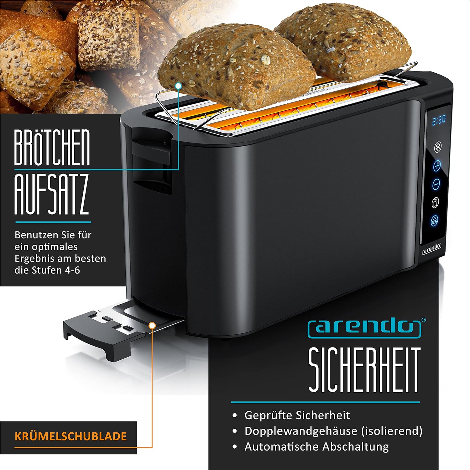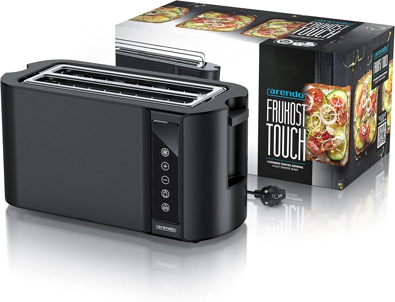 Arendo - Тостер от неръждаема стомана с дълъг отвор за 4 филии - Сензорен екран - Двойни стени - 1500 W - Вградена приставка за хлебчета - 7 нива на изпичане - Центриране на хляба - Дисплей за оставащо време - Памет