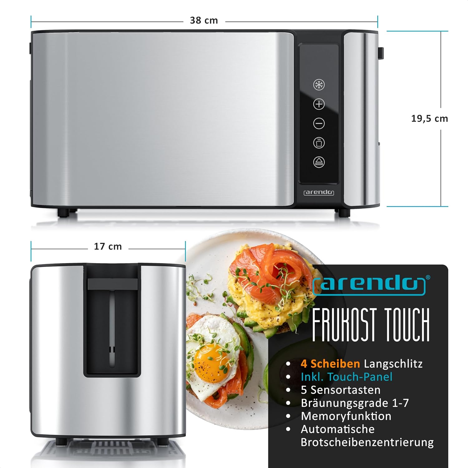 Arendo - Тостер от неръждаема стомана с дълъг отвор за 4 филии - Сензорен екран - Двойни стени - 1500 W - Вградена приставка за хлебчета - 7 нива на изпичане - Центриране на хляба - Дисплей за оставащо време - Памет